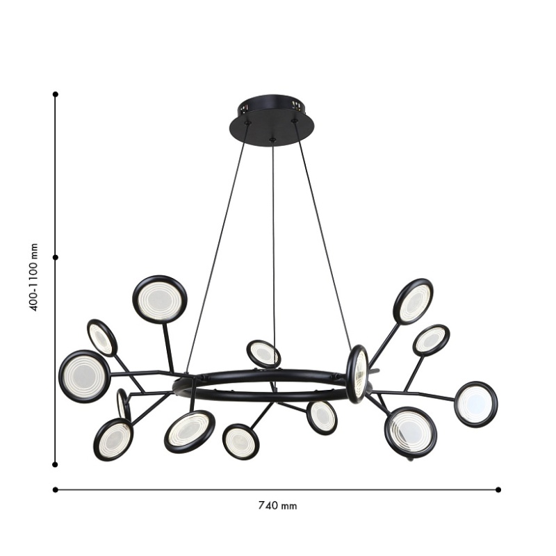 Металлический каркас матового черного цвета, внутренний периметр плафонов подсвечен лентой-LED, рассеиватель из акрила с нанесенным на него круговым узором, регулируемая высота.