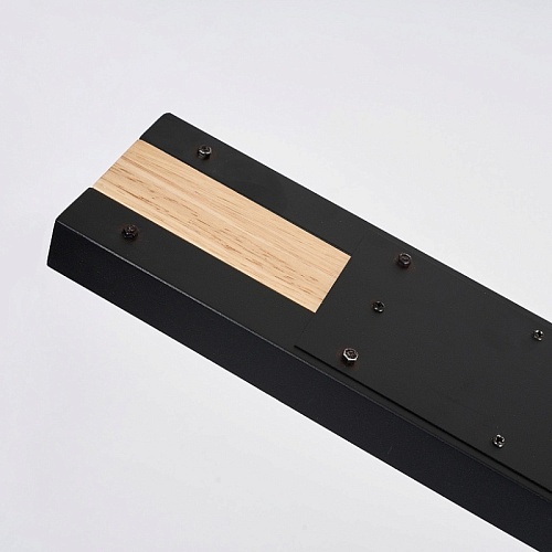 Металлический каркас черного матового цвета, декоративная вставка из МДФ с фактурой дерева на основании светильника, LED-модуль с рассеивателем из белого непрозрачного пластика и отдельные световые элементы.