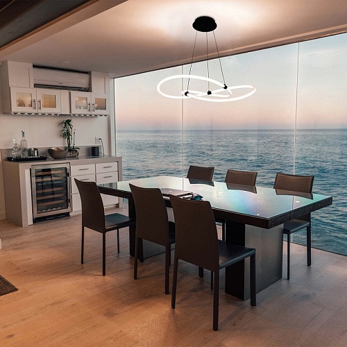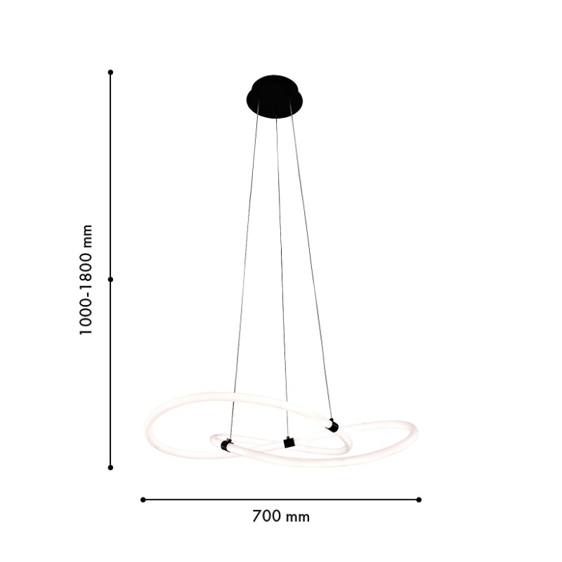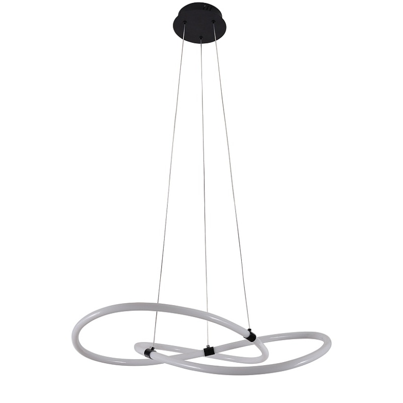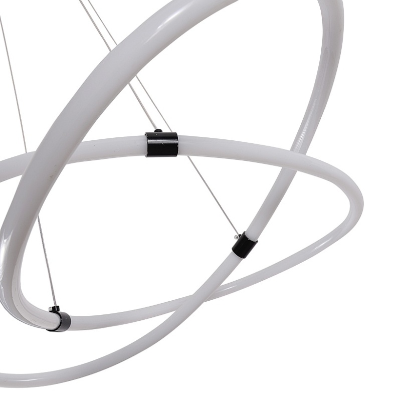 Металлический каркас в черном цвете, гибкая акриловая трубка белого цвета со встроенной круговой лентой LED, пульт дистанционного управления, регулируемая высота.