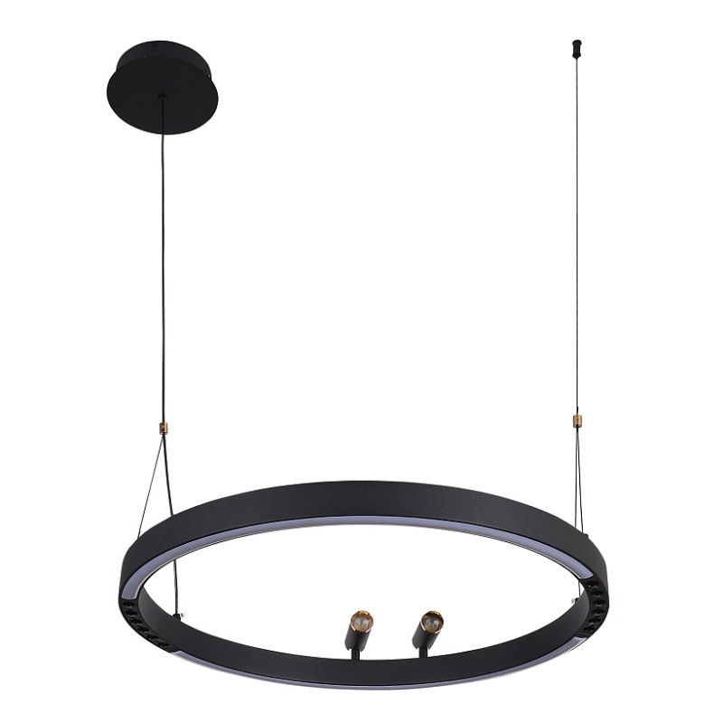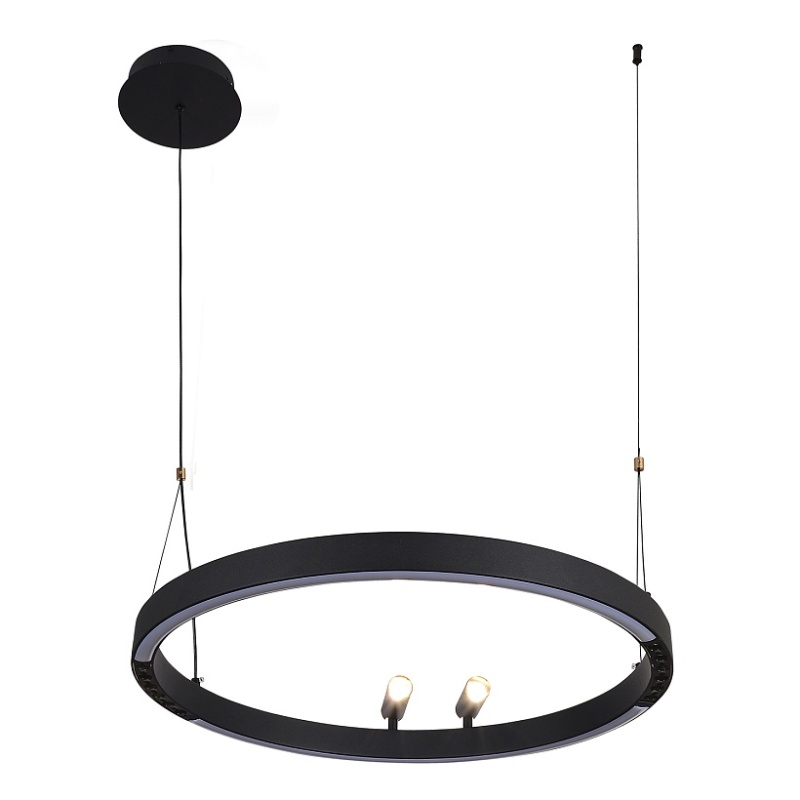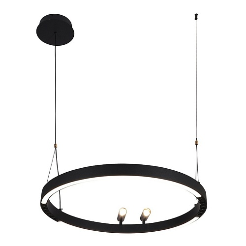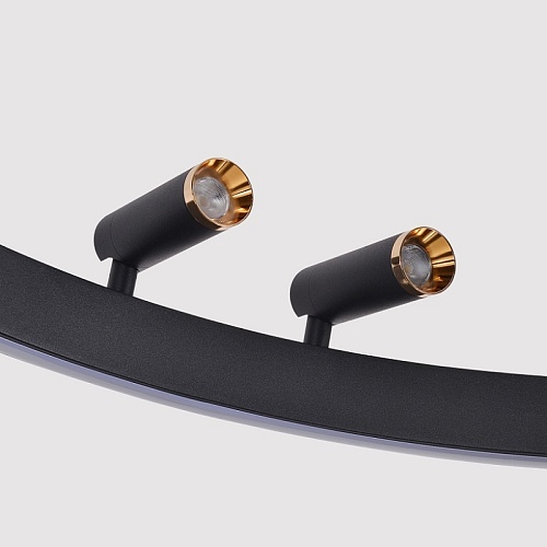 Металлический каркас черного цвета, на декоративном кольце размещены несколько технических источников света, включая поворотные споты, встроенную линию с лентой LED и модули с гнездовыми светодиодами, пульт управления регулирует мощность и температуру света, регулируемая высота.