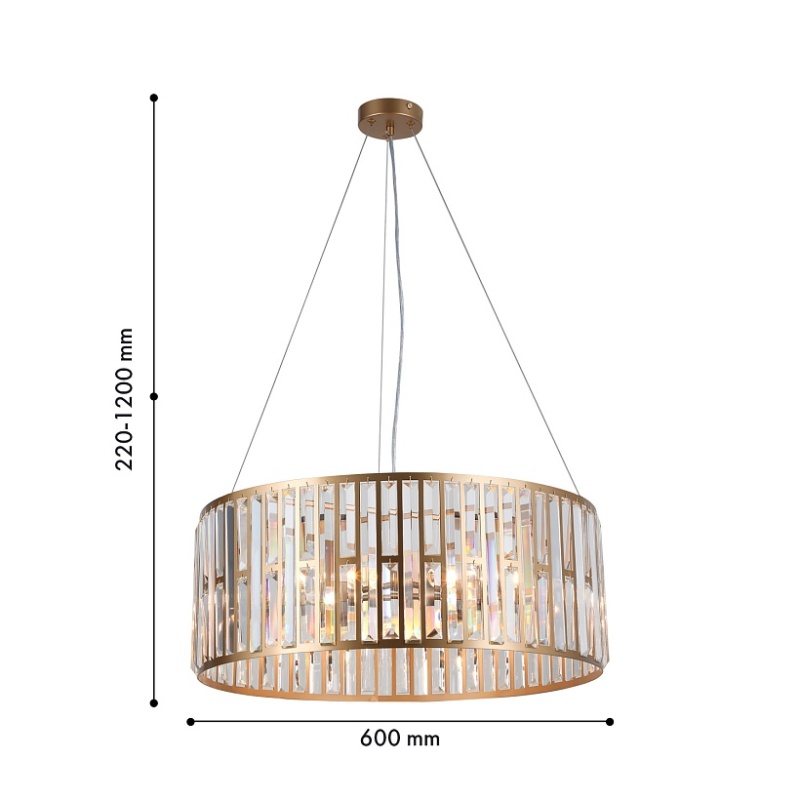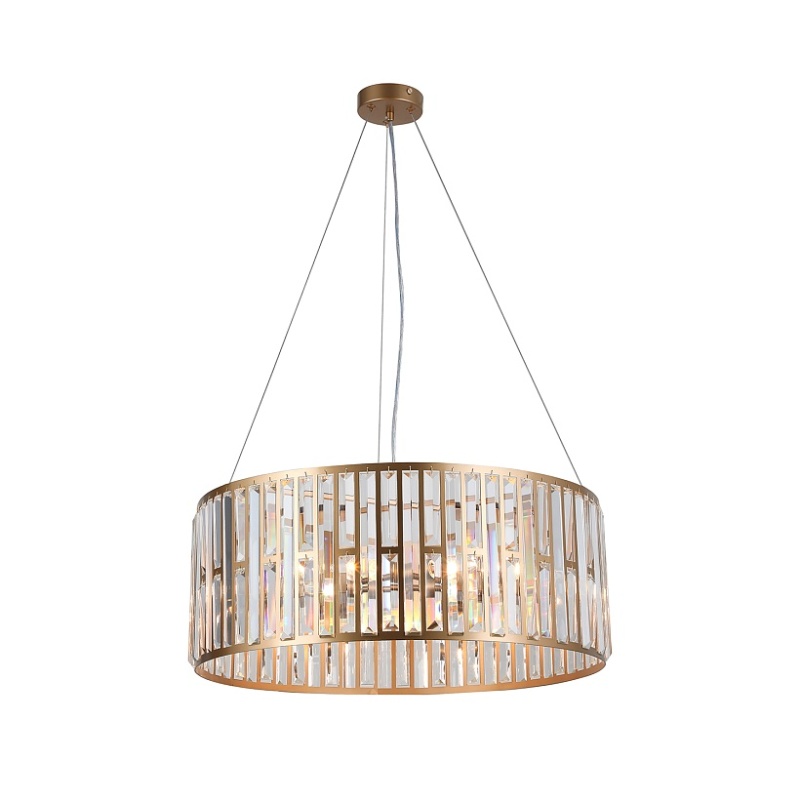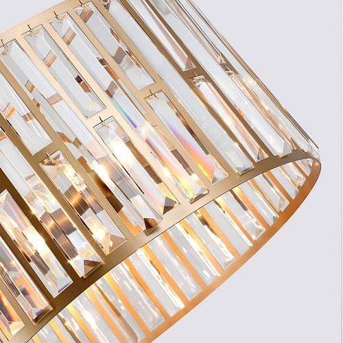 Металлический каркас золотого цвета с кольцом из чередующихся длинных и коротких металлических рамок, в которые инкрустированы прозрачные кристаллы трапециевидной формы. Цоколь E14, регулируемая высота.