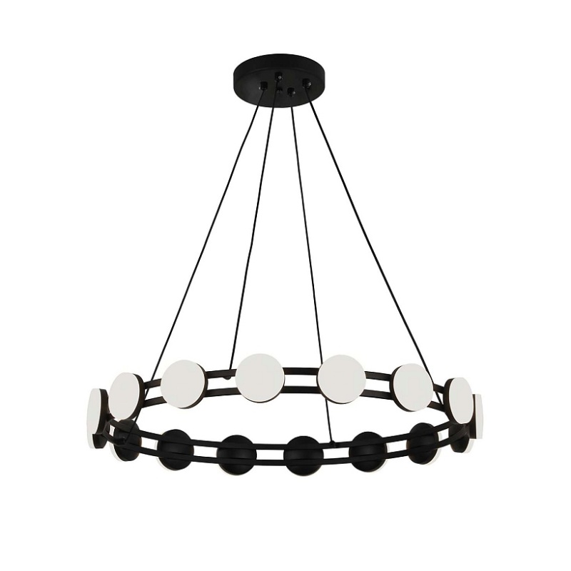 Каркас из металла черного матового цвета, круглые плоские плафоны белого цвета с акриловым рассеивателем, LED-модуль.