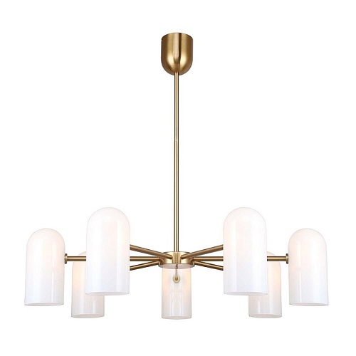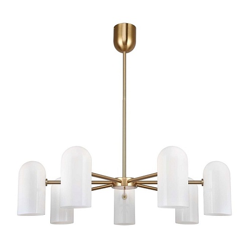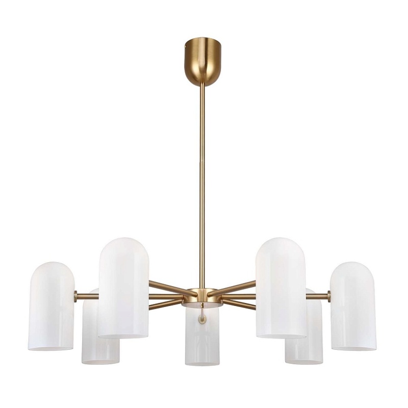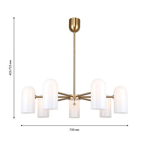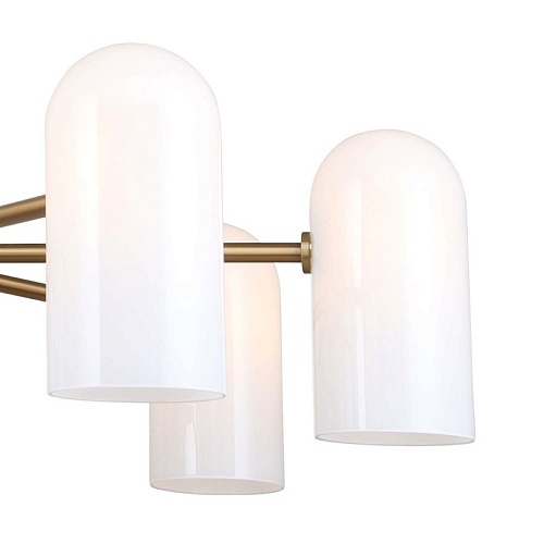 Каркас из металла цвета латунь, плафоны из белого стекла, регулируемая высота, сменная лампа G9.