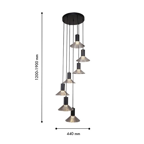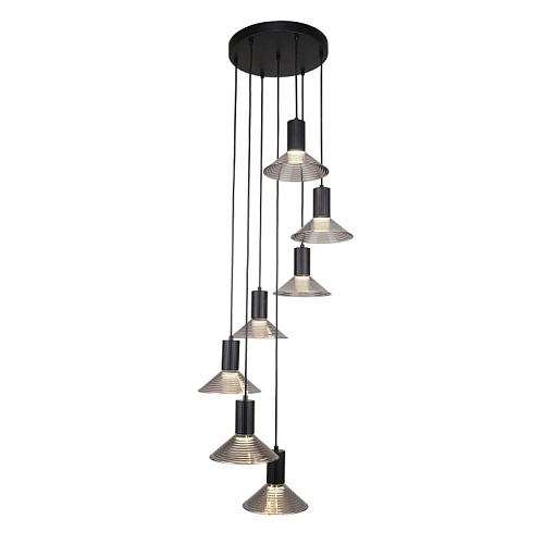 Каркас из металла черного матового цвета, плафоны из рифленого стекла, регулируемая высота, LED-модуль.