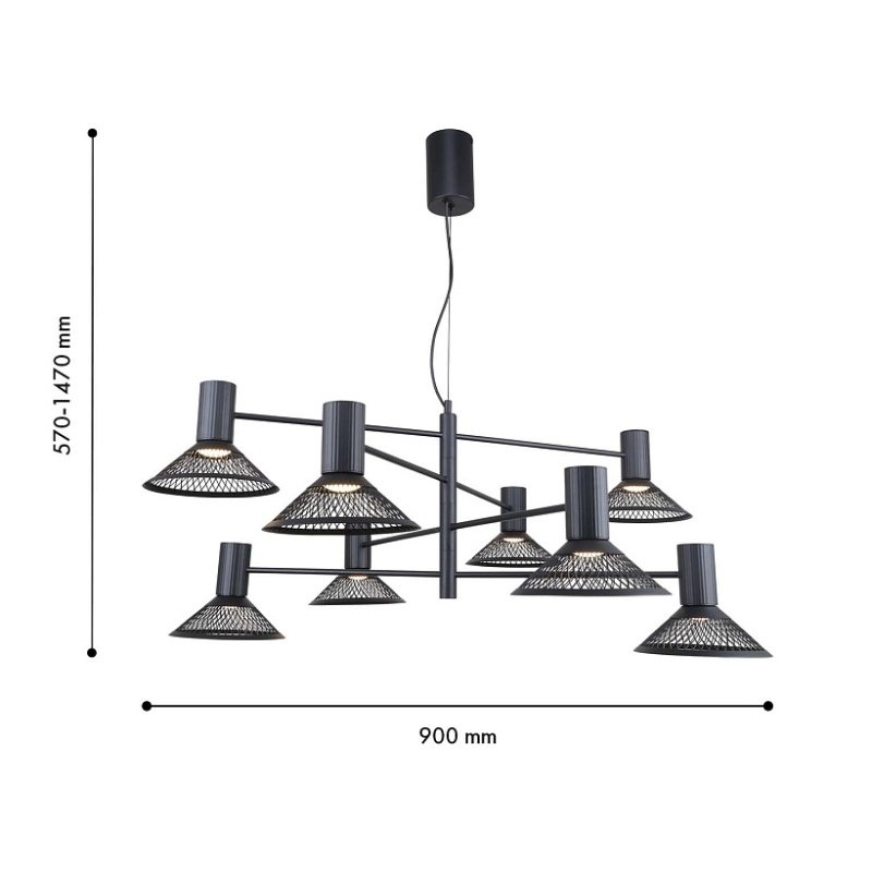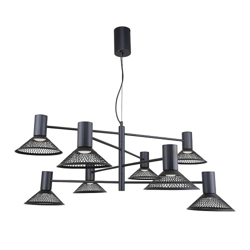 Каркас из металла черного матового цвета, плафоны из металлической сетки, регулируемая высота, LED-модуль.
