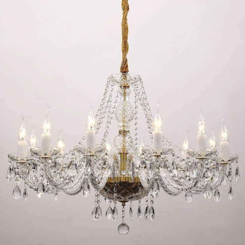 Металлический каркас золотого цвета, хрусталь высшего качества и стеклянные рожки и блюдца прозрачного цвета.