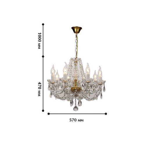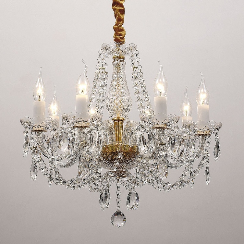 Металлический каркас золотого цвета, хрусталь высшего качества и стеклянные рожки и блюдца прозрачного цвета.