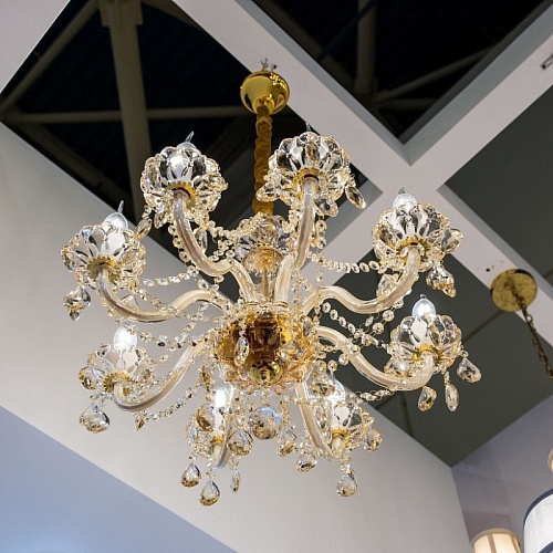 Металлический каркас золотого цвета, хрусталь высшего качества, стеклянные рожки и блюдца цвета "золотое шампанское".