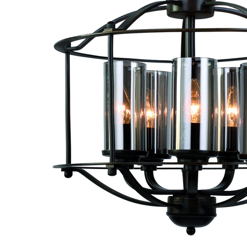 Металлический каркас черного цвета, стеклянные плафоны дымчато-серого цвета, регулируемая высота.