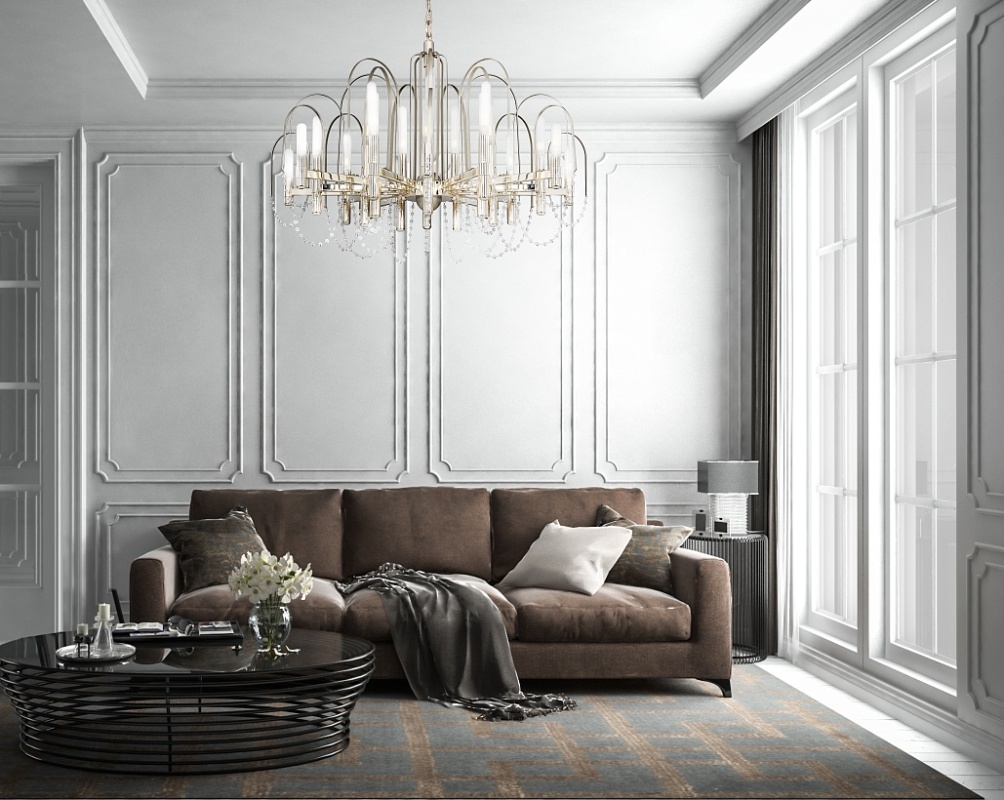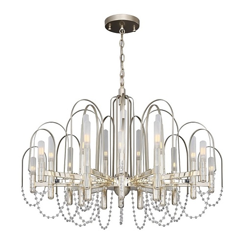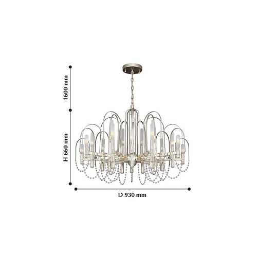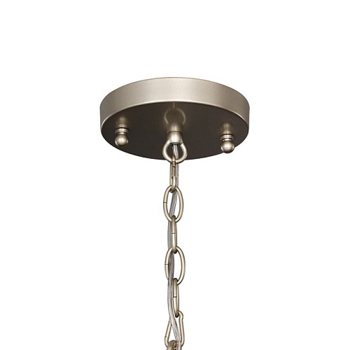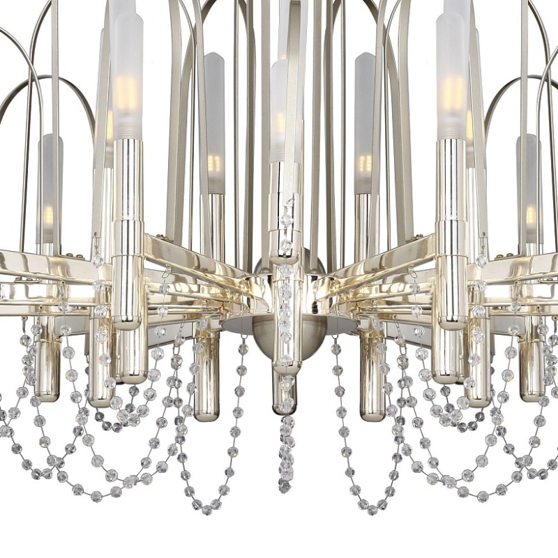 Каркас цвета золотистого шампанского, декор из цепочек с хрустальными шариками, лампы G9 закрывают плафоны из матового стекла.