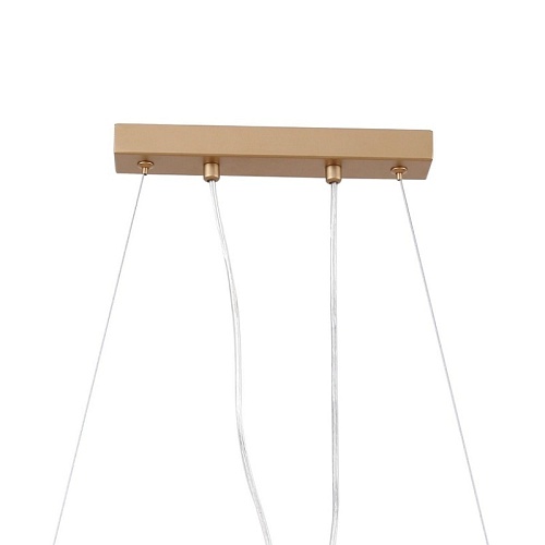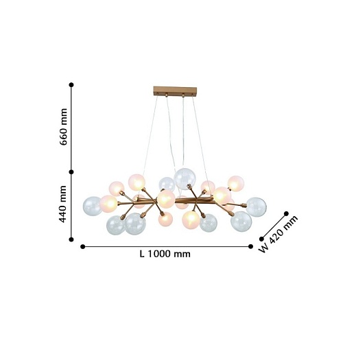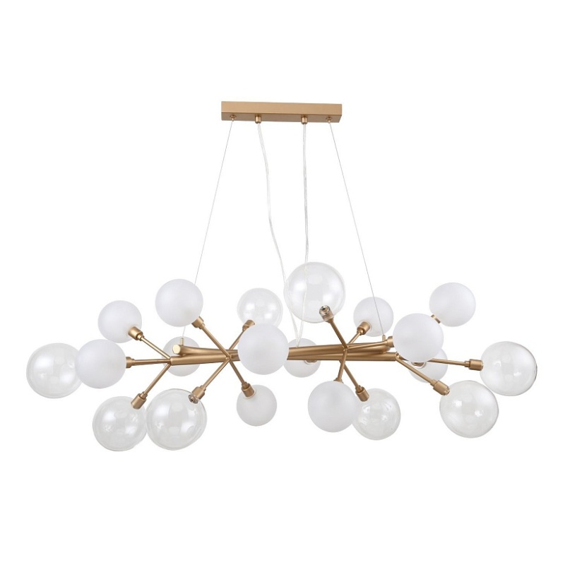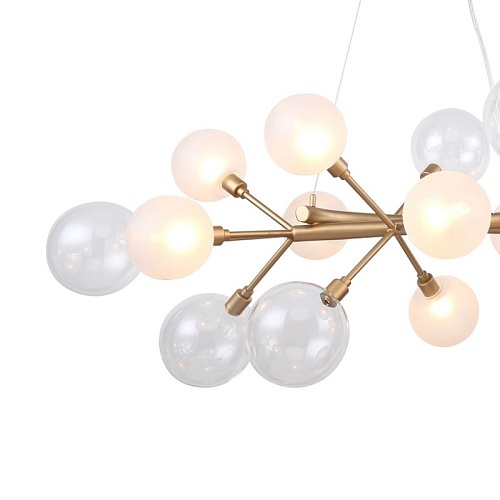 Металлический каркас золотого цвета, плафоны разного размера из белого и прозрачного стекла, регулируемая высота.