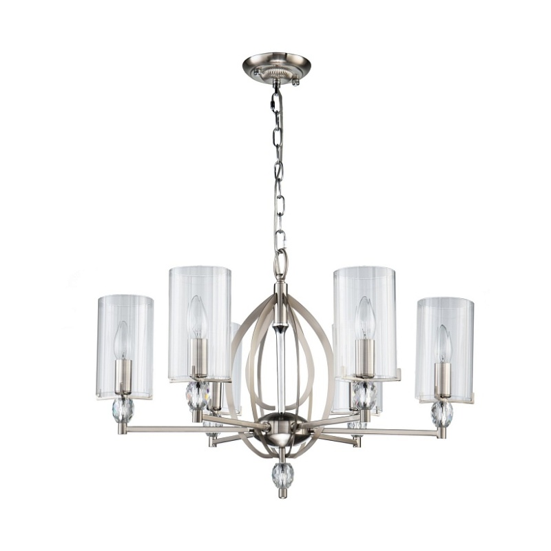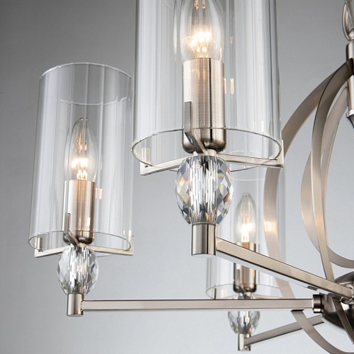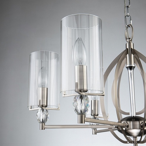 Каркас цвета никель, плафоны из прозрачного узорного стекла, декоративные элементы из прозрачного хрусталя.