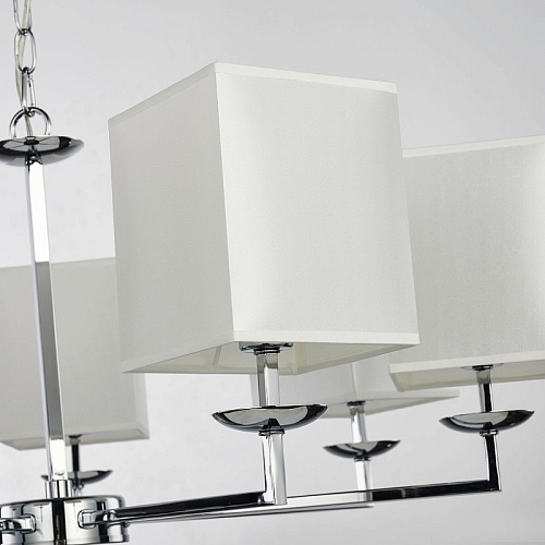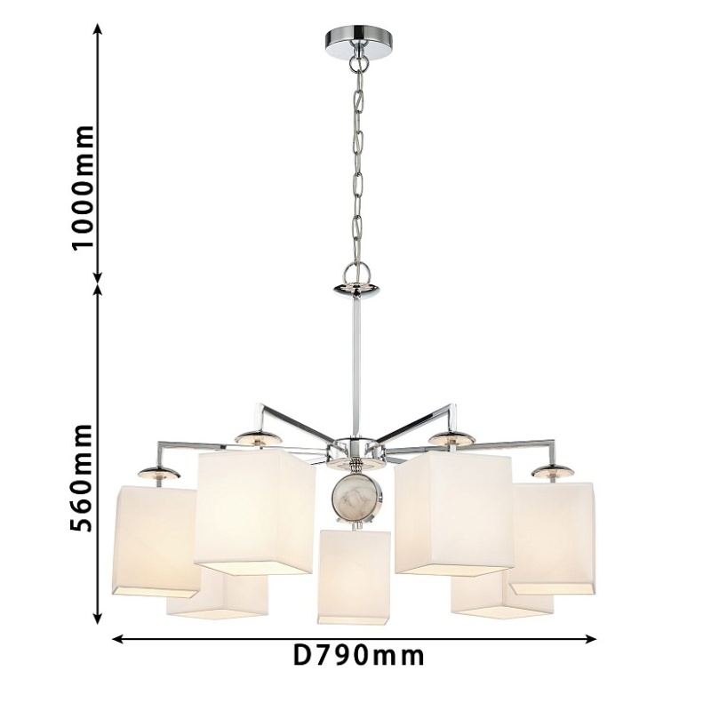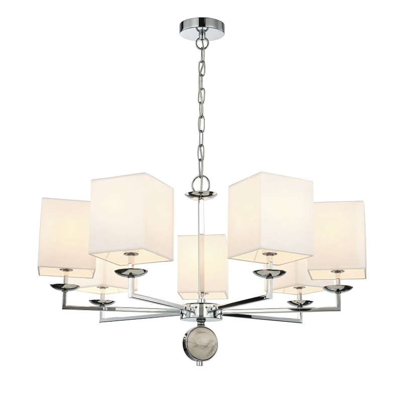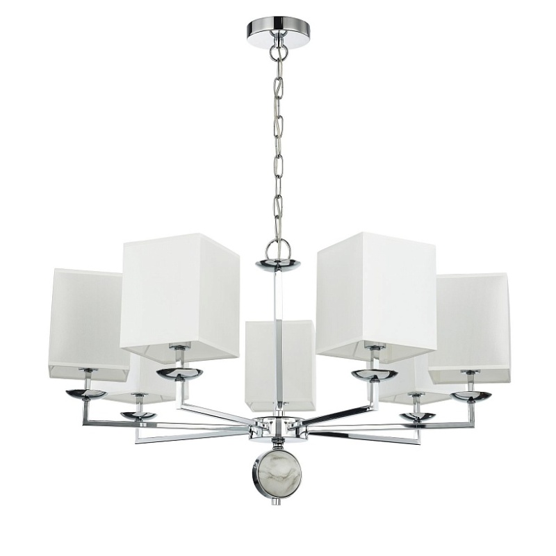 Хромированный, металлический каркас, плафоны из белой ткани, декор - имитация белого мрамора, каркас можно монтировать как вверх, так и вниз плафонами.