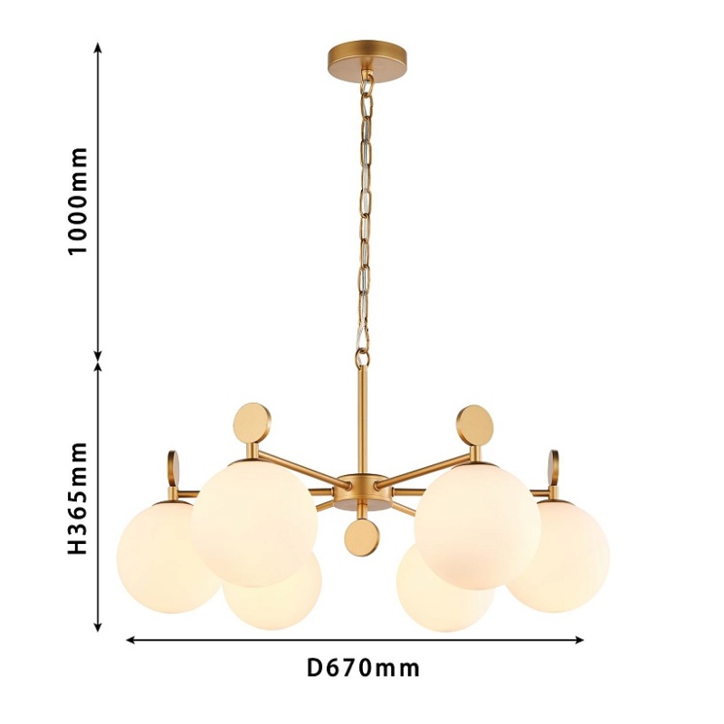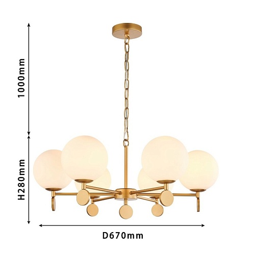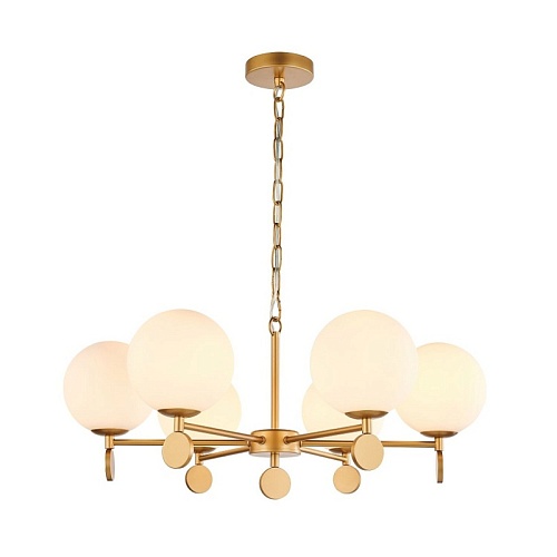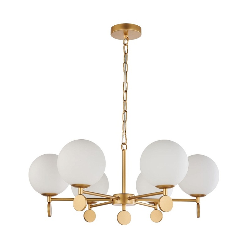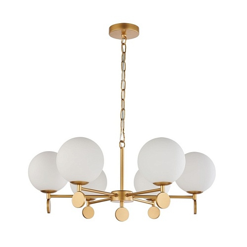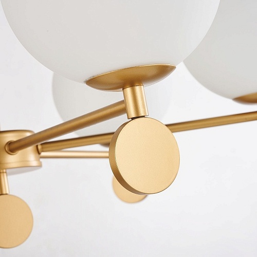 Каркас золотого цвета, плафоны из стекла цвета опала, люстру можно монтировать плафонами вверх или вниз, сменные лампы, цоколь Е14.