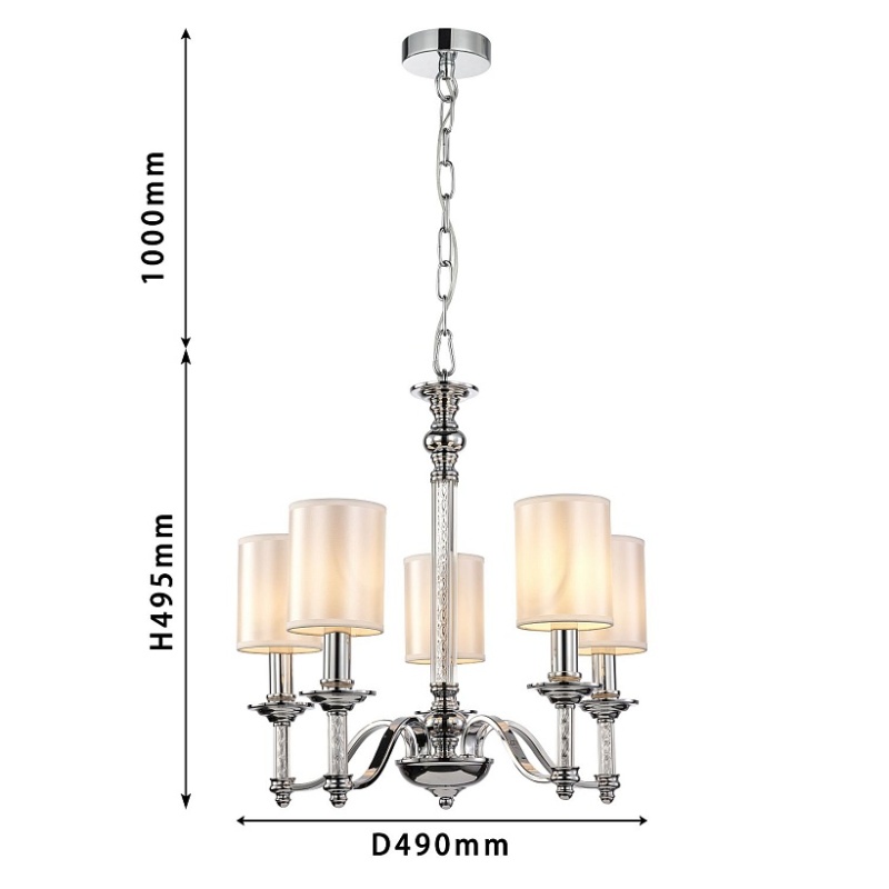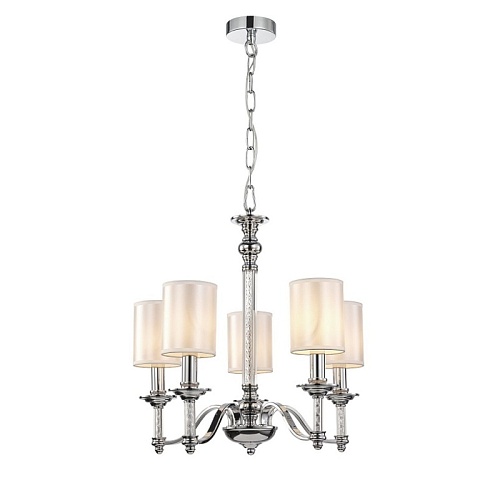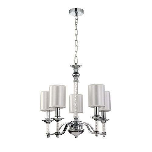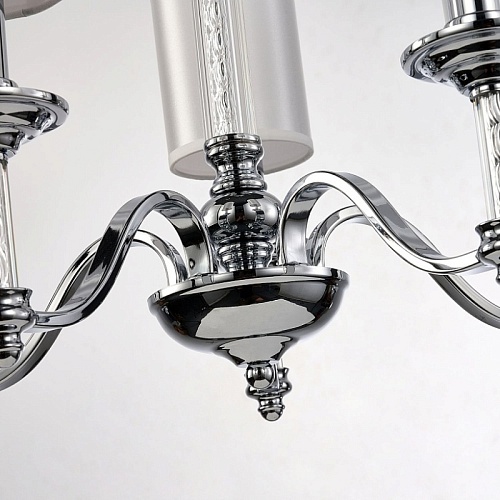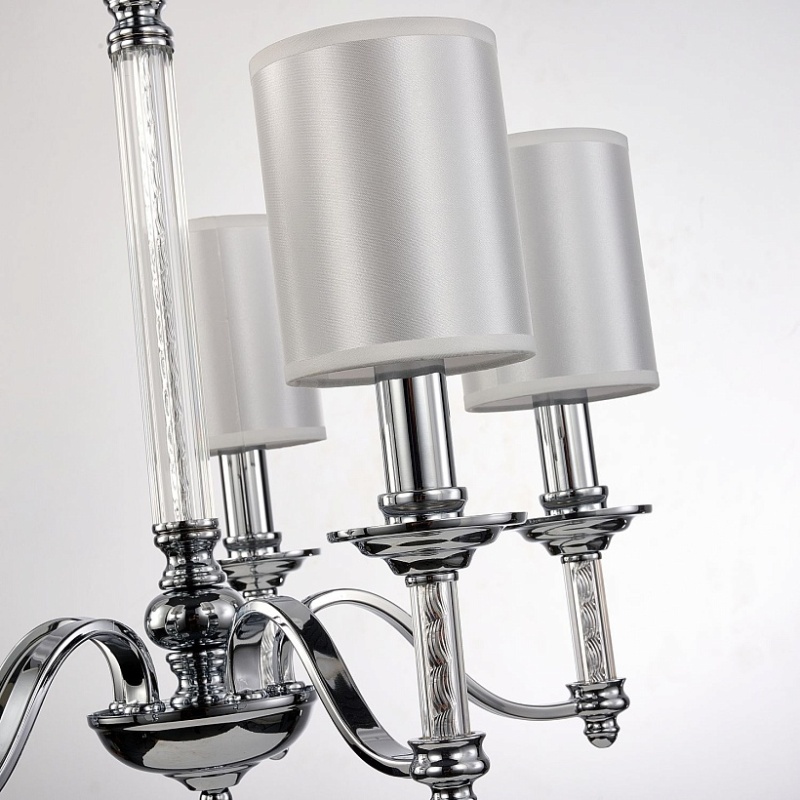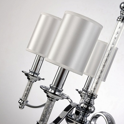 каркас цвета хром, плафоны из белой атласной ткани, декоративные элементы из прозрачного стекла