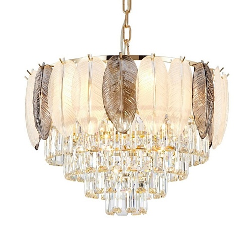 Каркас цвета золотой гальваники, декоративные лепестки из белого и серого стекла, хрусталь оригинальной прямоугольной формы высшего качества.