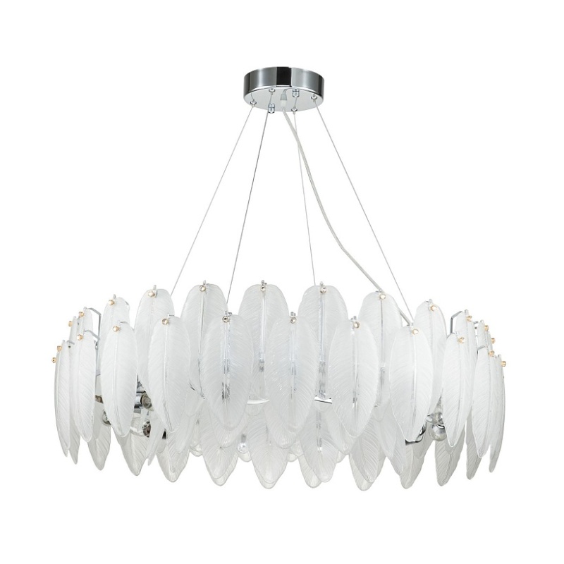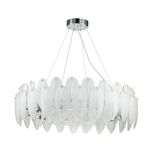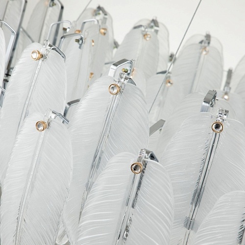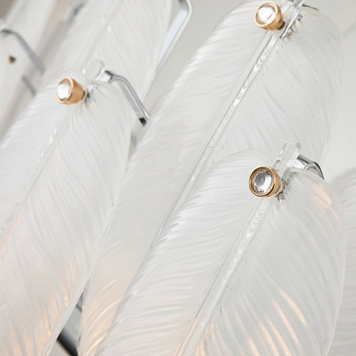 Каркас цвета хром, лепестки из полупрозрачного стекла, декор в виде кристалла в золотом обрамлении на каждом лепестке.