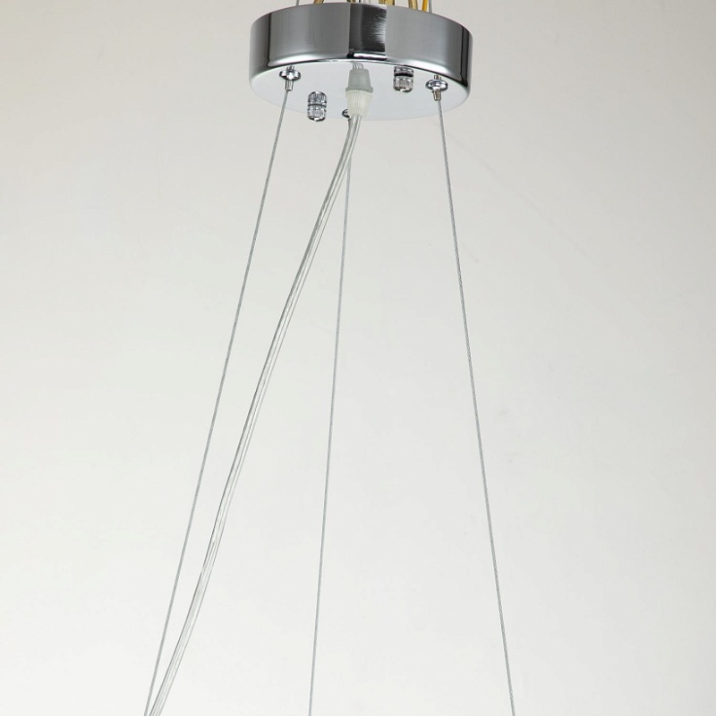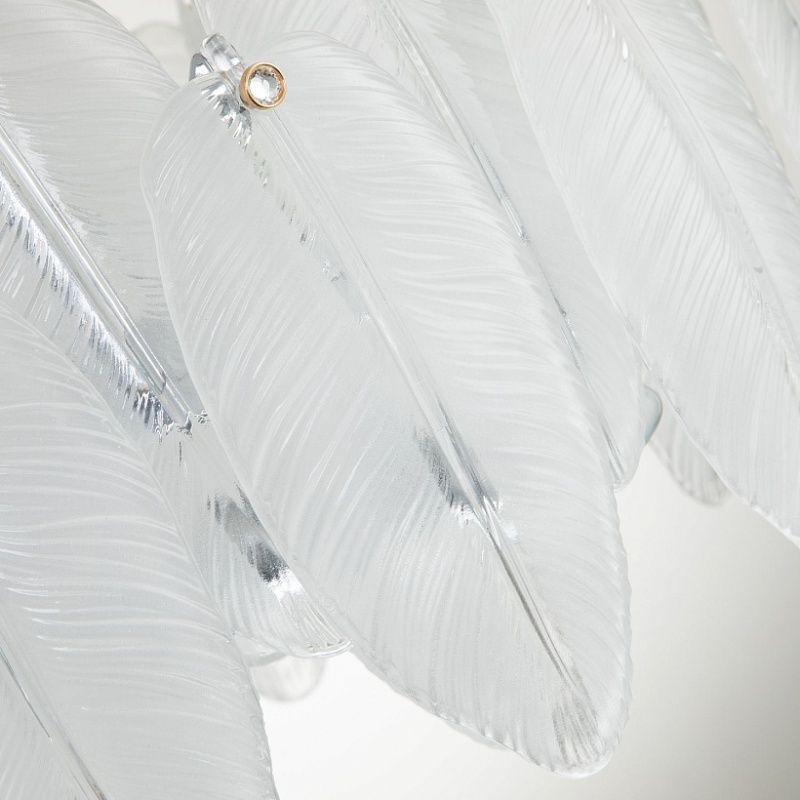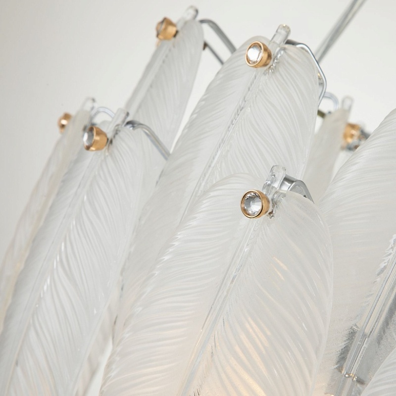 Каркас цвета хром, лепестки из полупрозрачного стекла, декор в виде кристалла в золотом обрамлении на каждом лепестке.