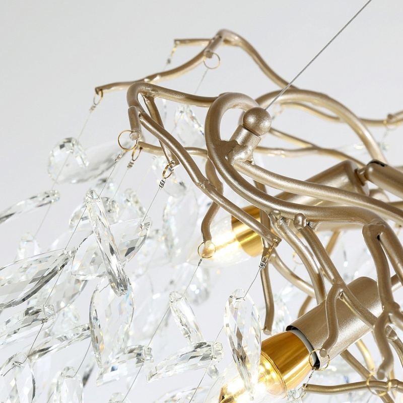 Металлический каркас цвета матового золота, напоминающий сплетенные ветви дерева, плафон декорирован хрустальными подвесками в виде листочков.