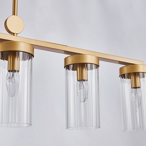 Каркас золотого цвета, плафоны из прозрачного рельефного стекла, регулируемая высота.