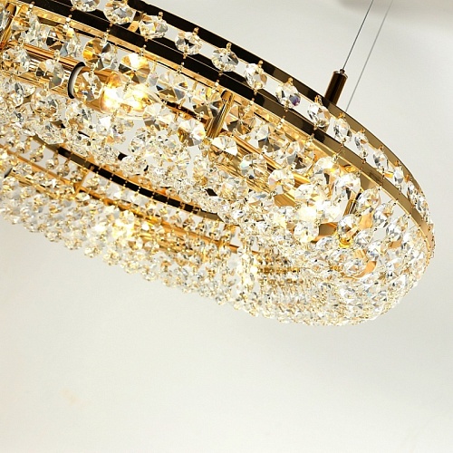 Каркас цвета светлого золота, плафон в виде объемного обруча состоит из прозрачных хрустальных восьмигранников.