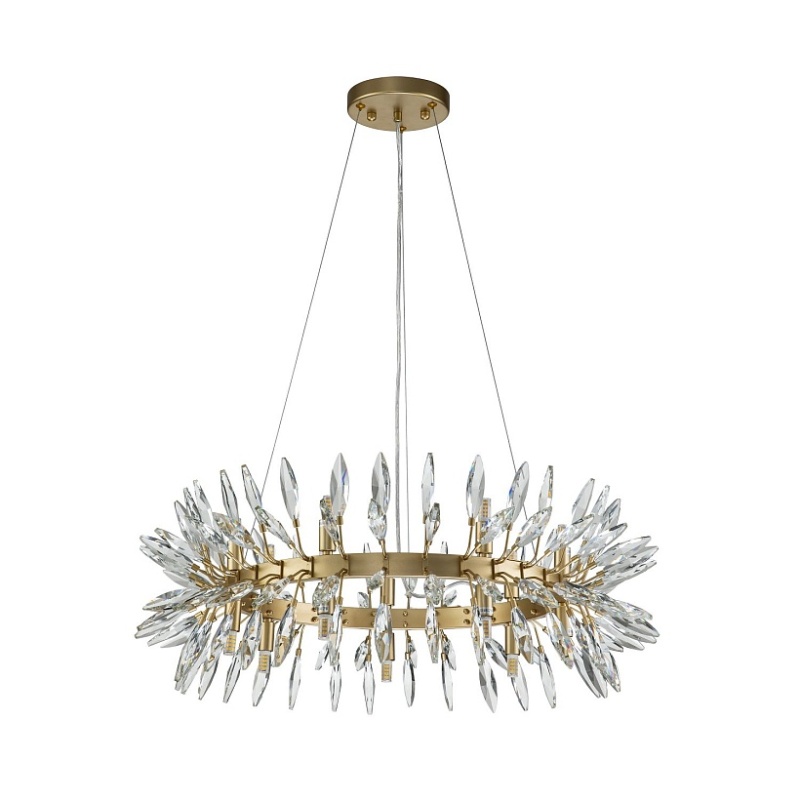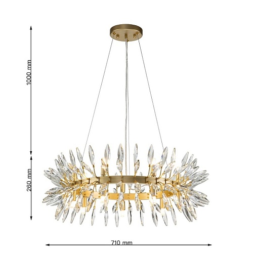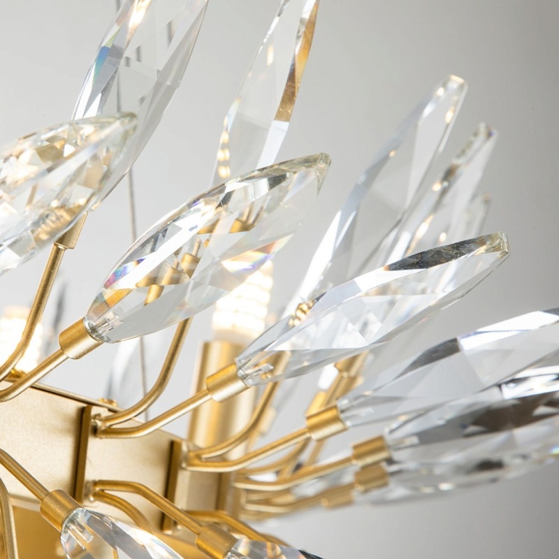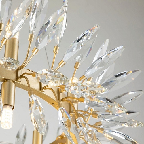 каркас цвета золота, источники света направлены вверх и вниз, декоративные элементы из прозрачного хрусталя миндалевидной формы, лампу G9 можно менять