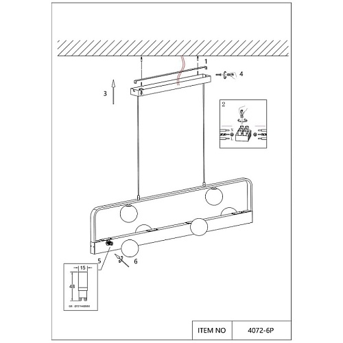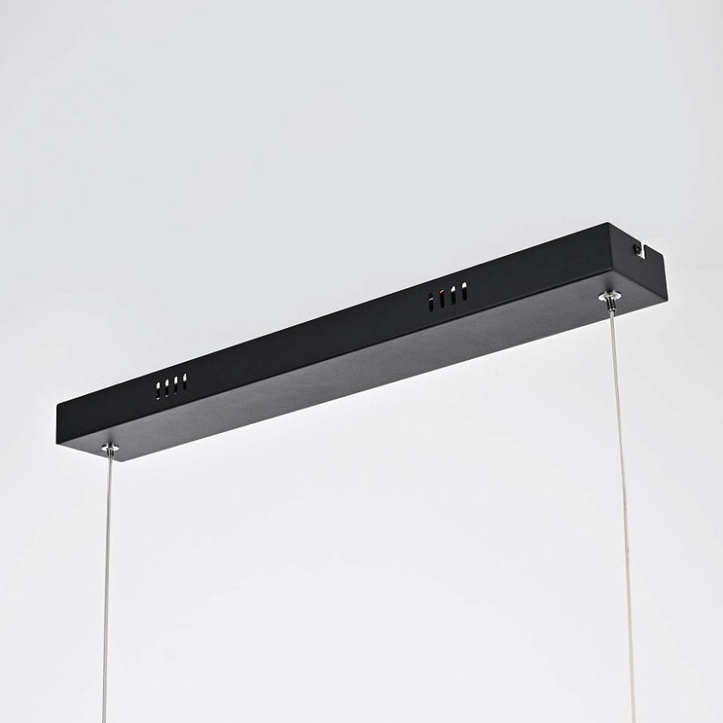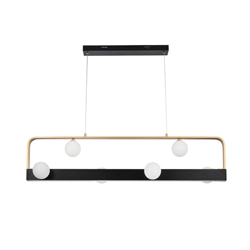 Каркас черного цвета в сочетании с золотым, плафоны из белого акрила, два источника света - встроенная лента LED и лампы внутри плафонов.
