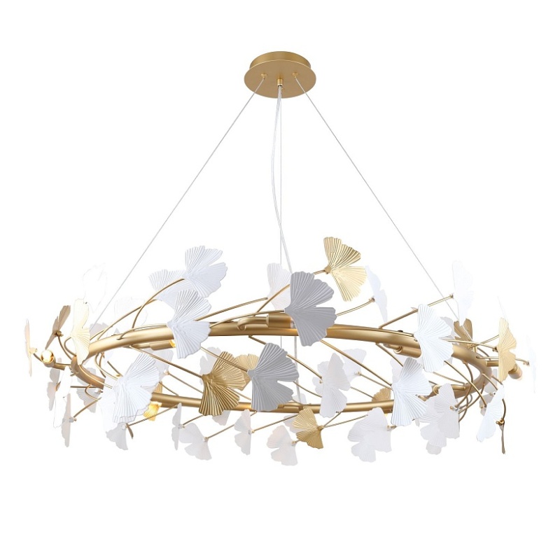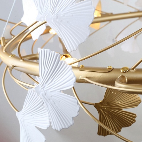 Металлический каркас цвета окрашенное золото, декор в виде листьев Гинкоа в белом и золотом цвете, сменные лампы.