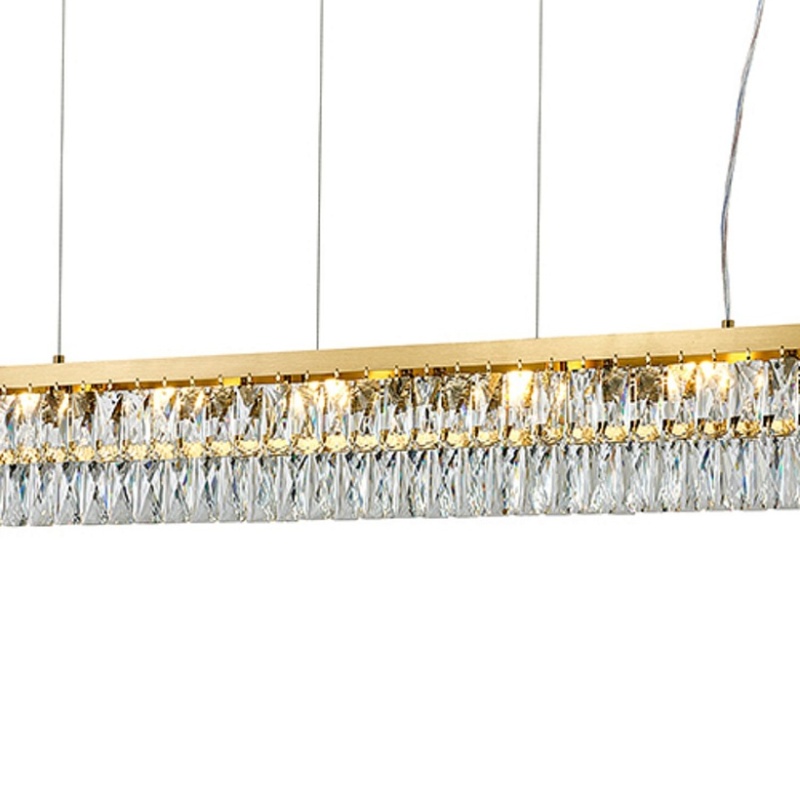 Прямоугольный металлический каркас золотого цвета, плафон состоит из прозрачного хрусталя оригинальной формы, часть каркаса фиксируется тросиками для баланса.