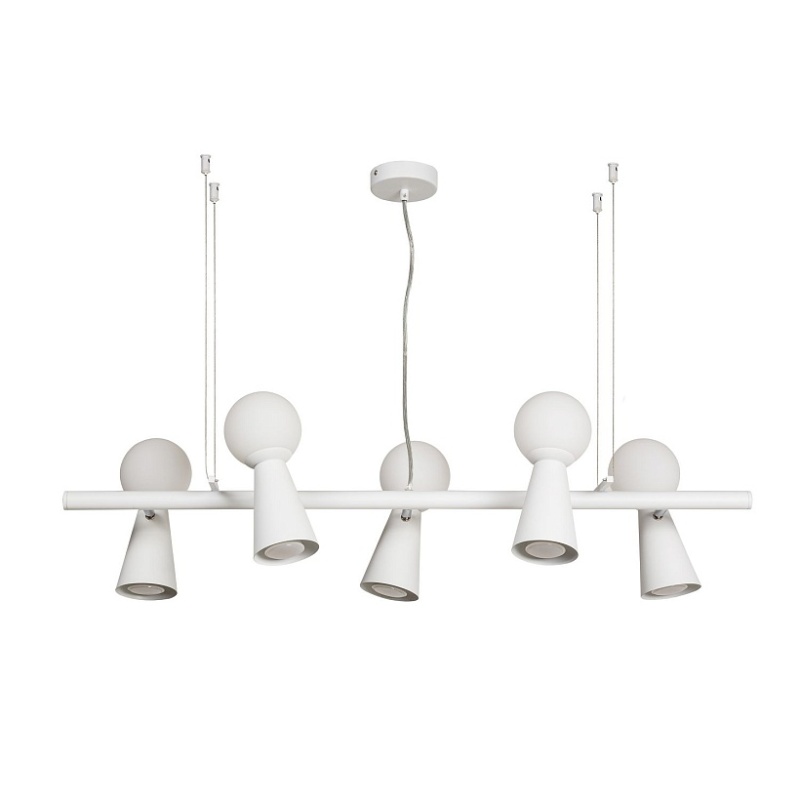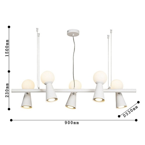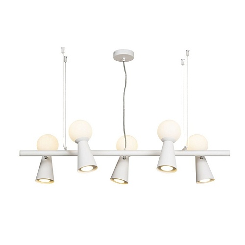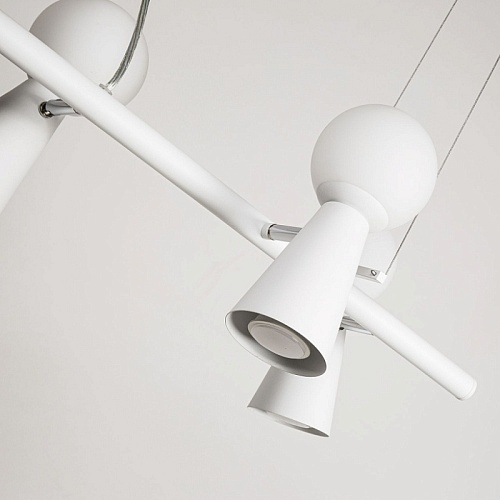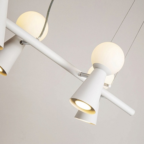 каркас белого цвета, поворотные плафоны с двумя источниками света - стеклянный выдувной матовый шар с лампой G9 и металлический конус с лампой GU10, л