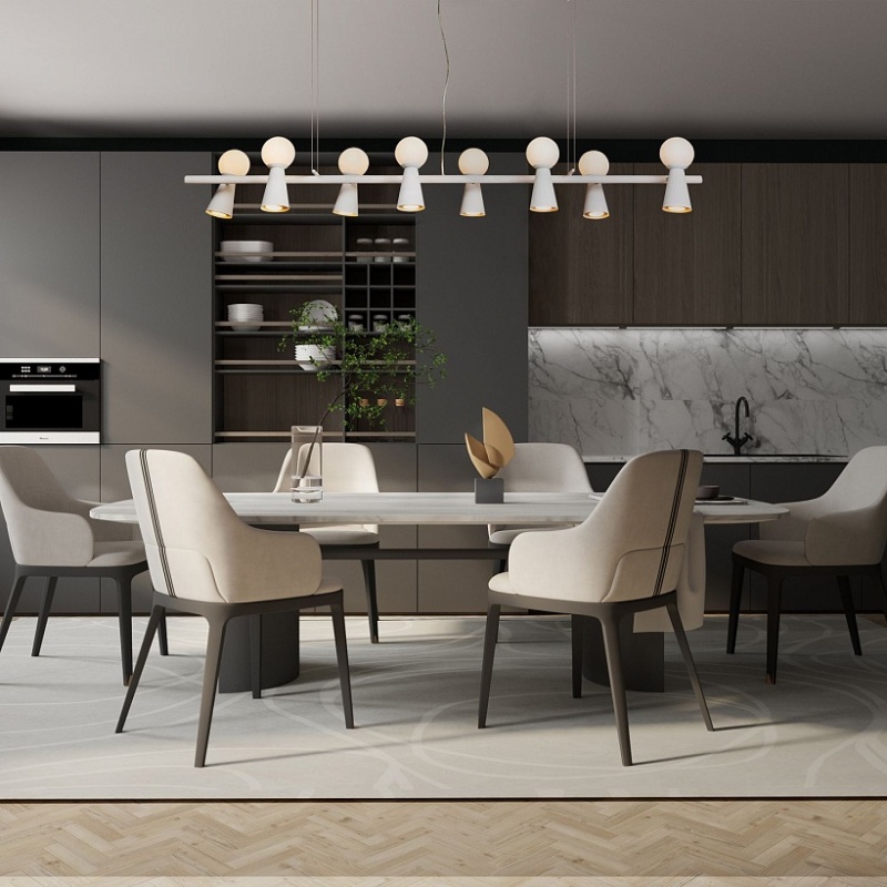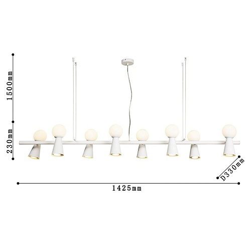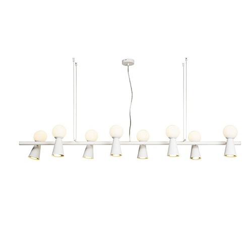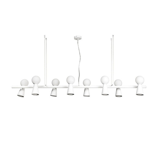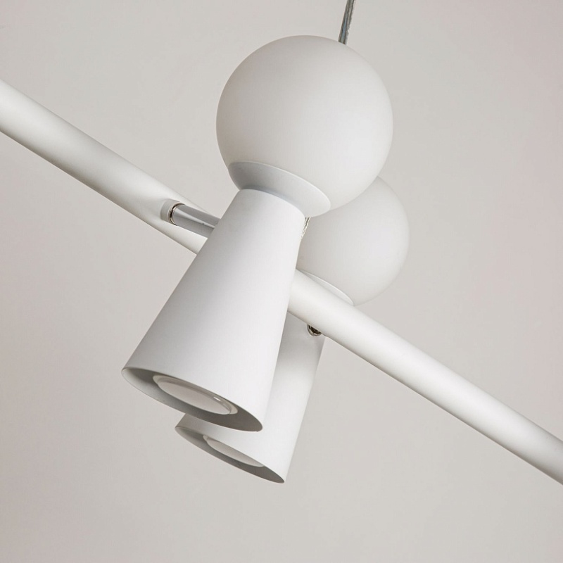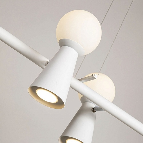 каркас белого цвета, поворотные плафоны с двумя источниками света - стеклянный выдувной матовый шар с лампой G9 и металлический конус с лампой GU10, л