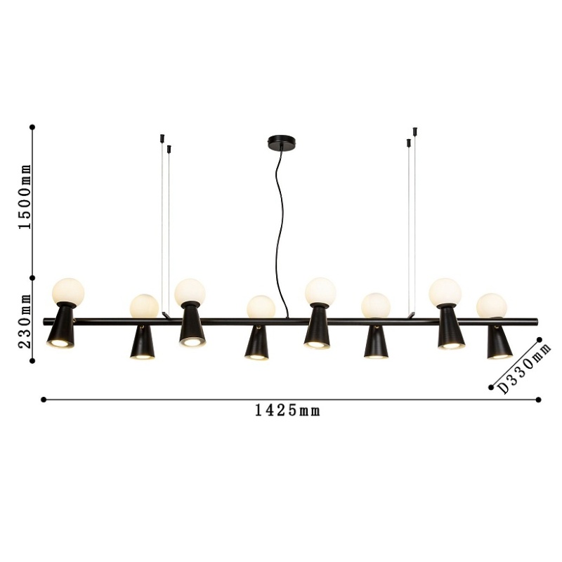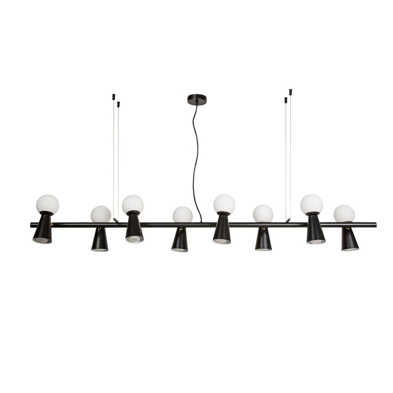 каркас черного цвета, поворотные плафоны с двумя источниками света - стеклянный выдувной матовый шар с лампой G9 и металлический конус с лампой GU10,