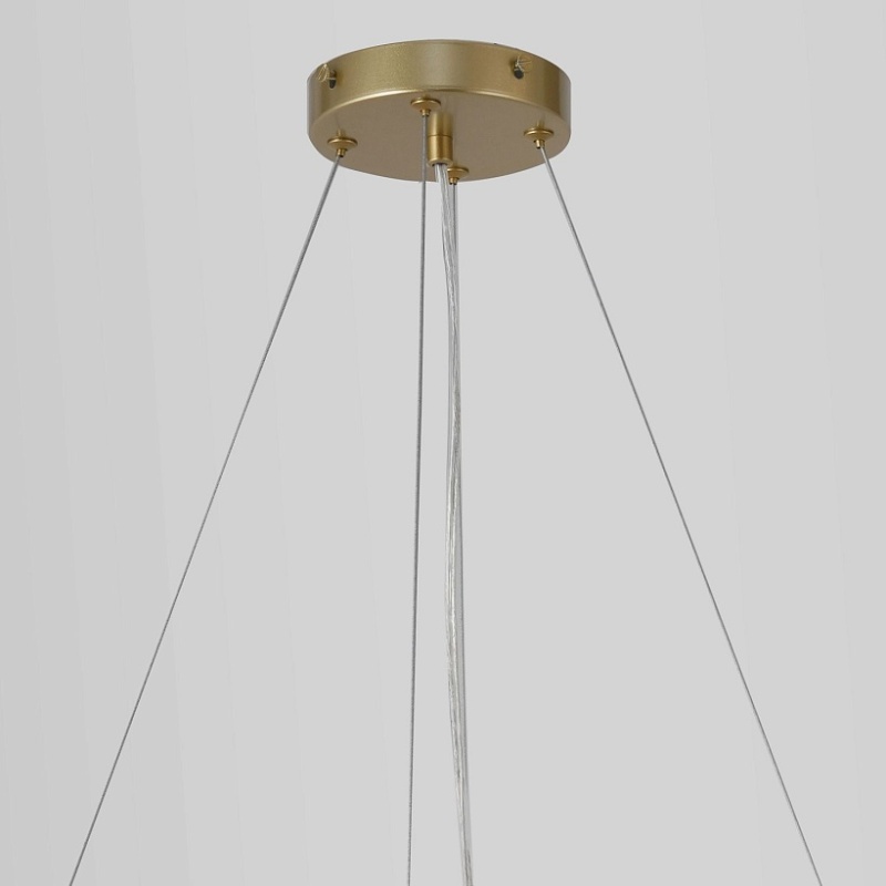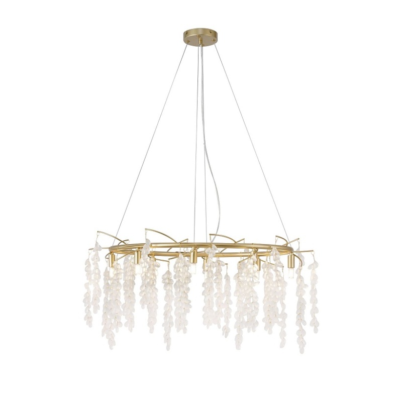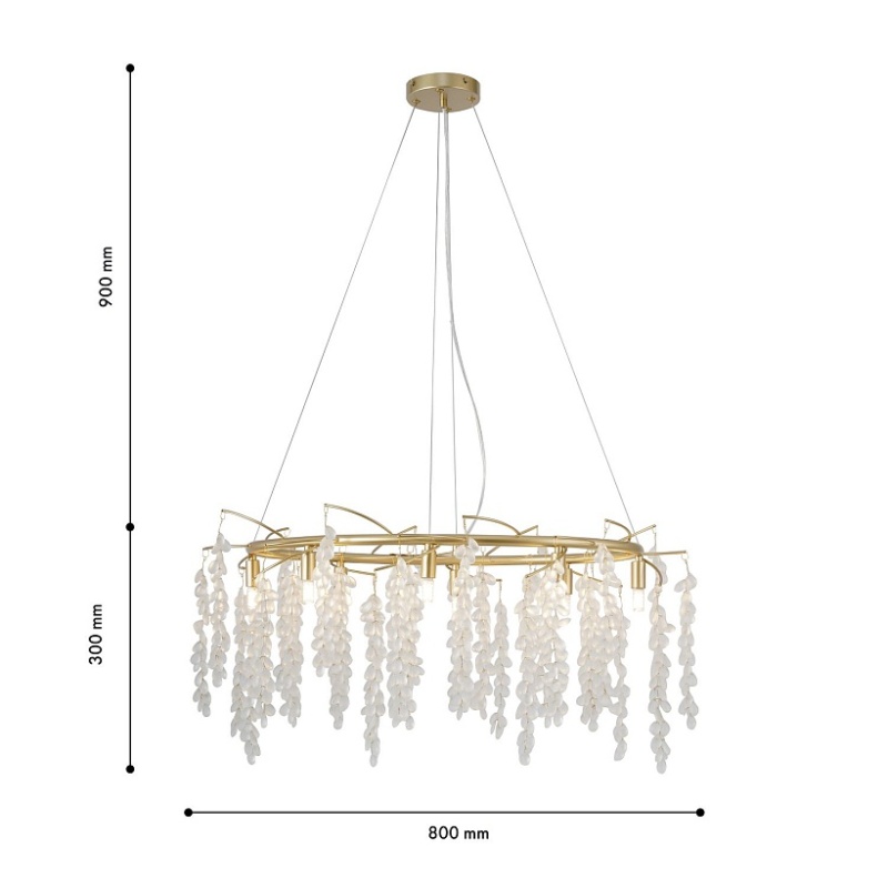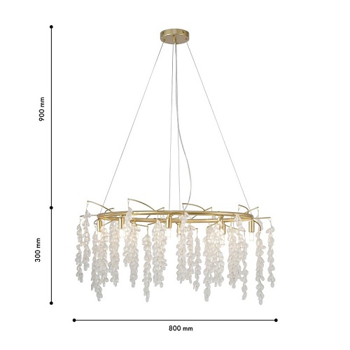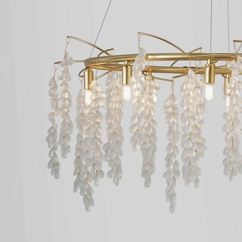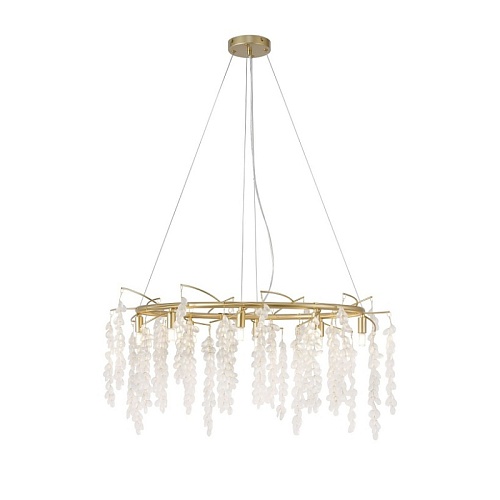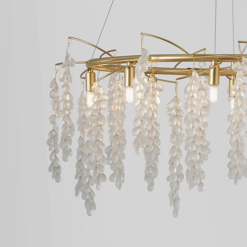 Каркас золотого цвета, декор из стёкол белого матового цвета в виде виноградной грозди. Высоту люстры можно регулировать. сменные лампы.