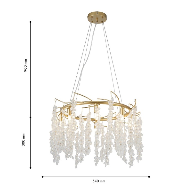 Каркас золотого цвета, декор из стёкол белого матового цвета в виде виноградной грозди. Высоту люстры можно регулировать. сменные лампы.