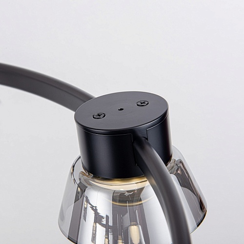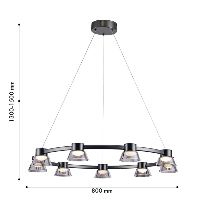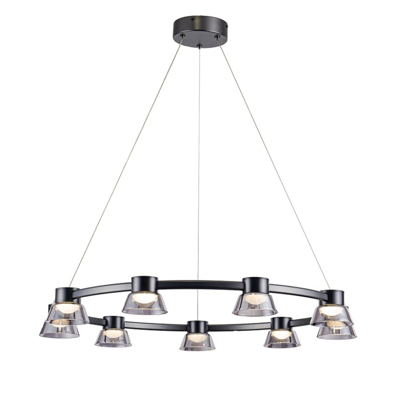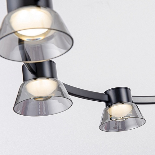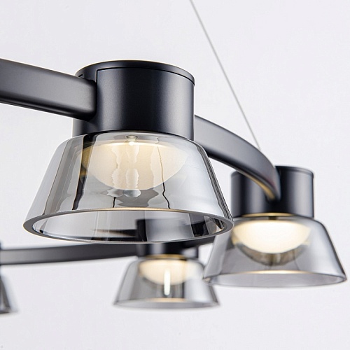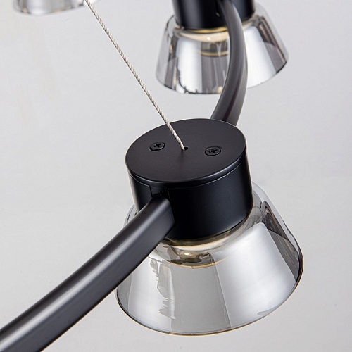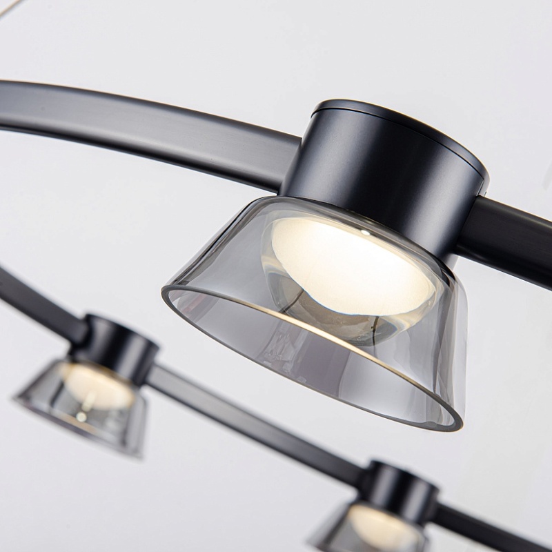 Металлический каркас черного цвета, внешний плафон из серого стекла, внутренний плафон из полу-прозрачного стекла в форме линзы, модуль LED, регулируемая высота, возможность использования универсальных креплений.