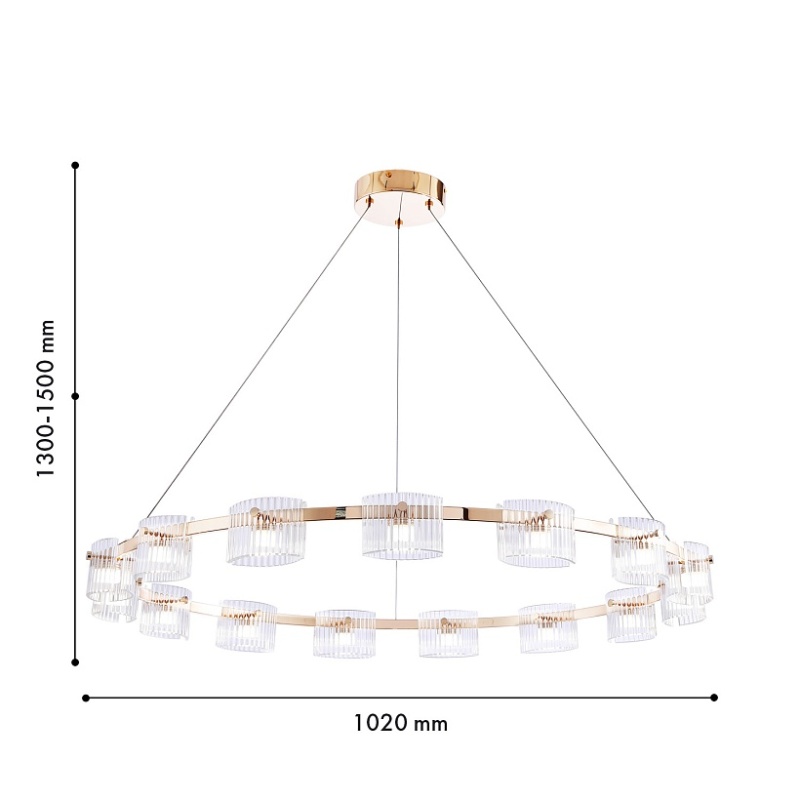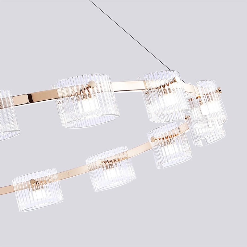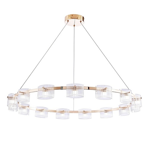 Металлический каркас в золотом цвете, с прозрачными рифлеными плафонами, каждый из которых состоит из двух слегка выгнутых стекол, закрепленных на заклепках с обеих сторон, модуль LED, регулируемая высота.