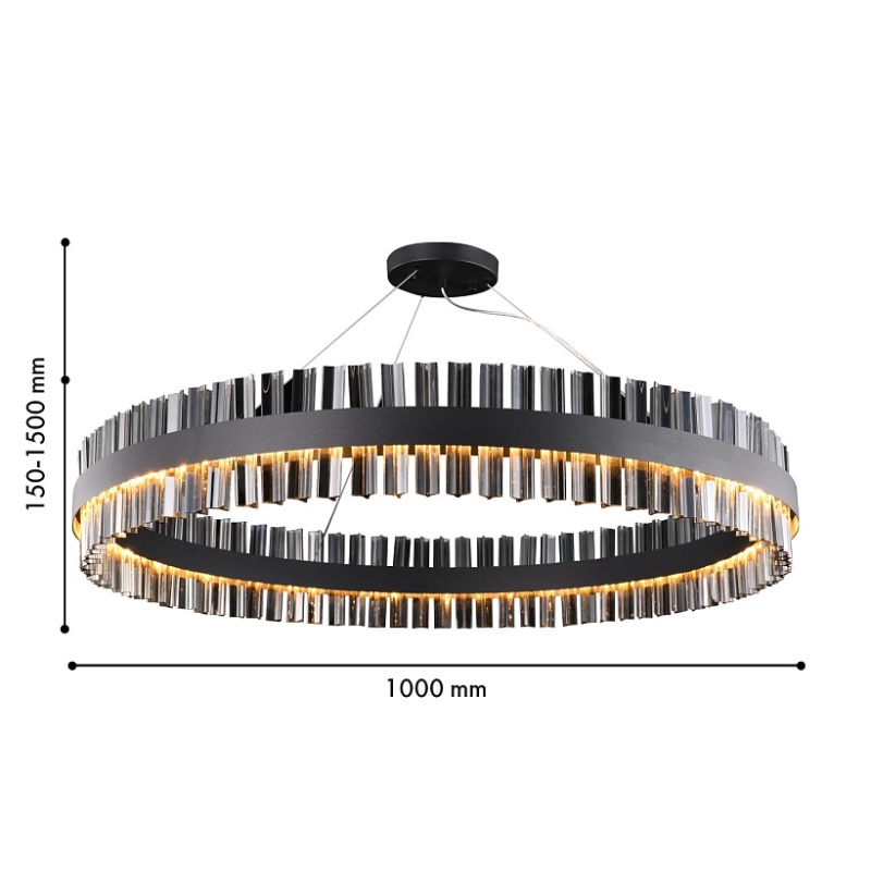 Металлический каркас черного цвета, дымчато-серый хрусталь, регулируемая высота, встроенная лента LED.