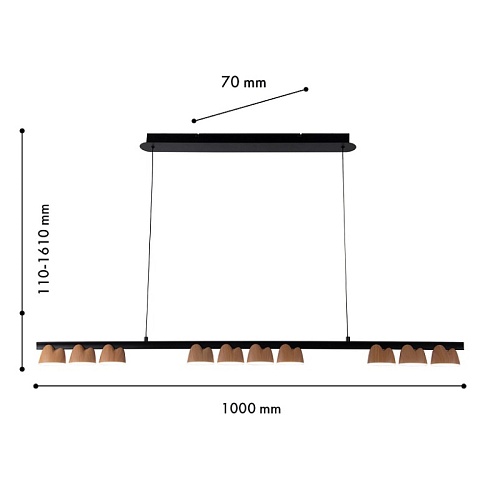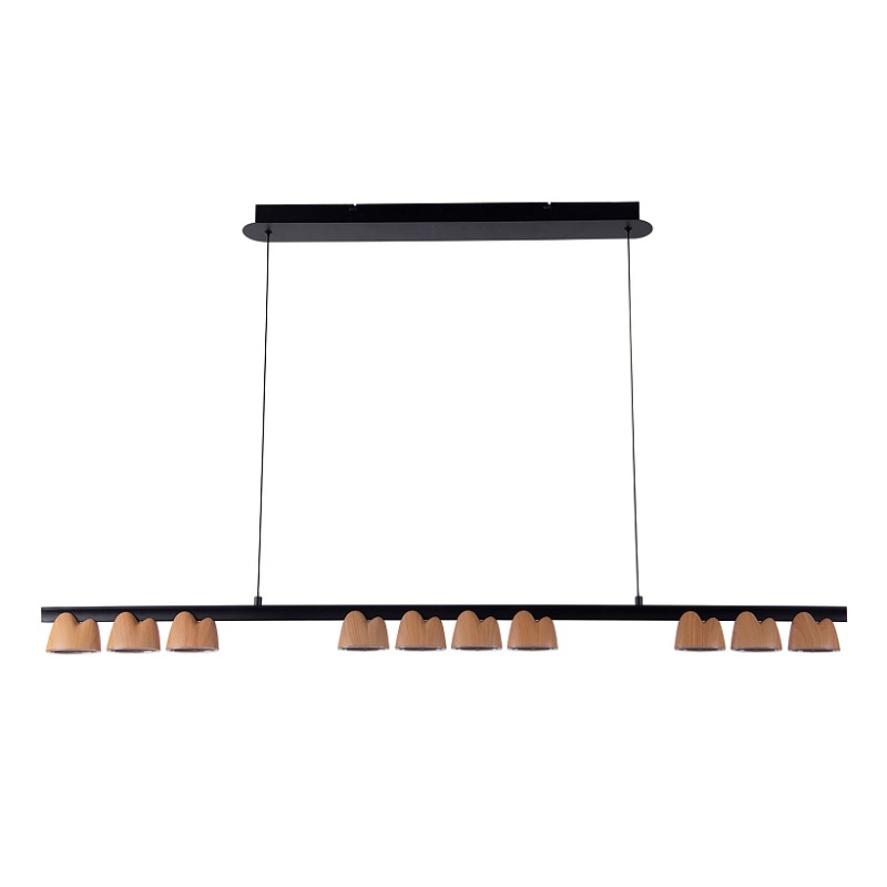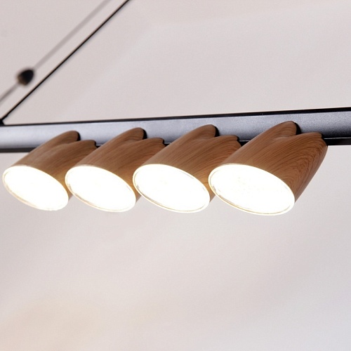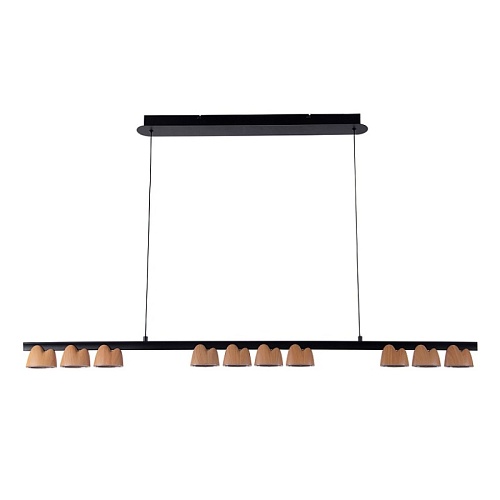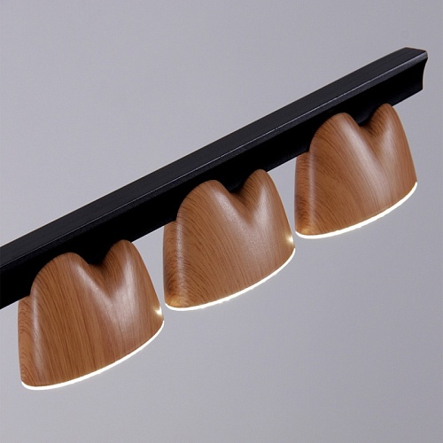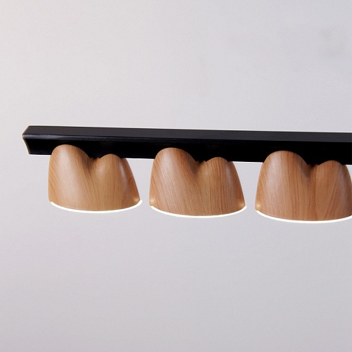 Металлический каркас черного матового цвета, плафоны цвета дерева, прозрачный акрил с узором, регулируемая высота.