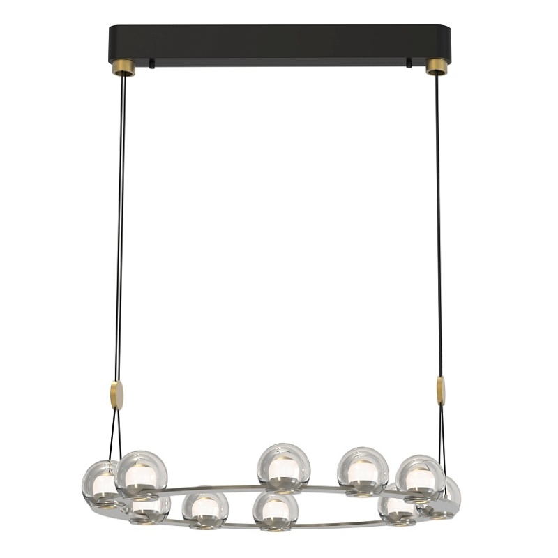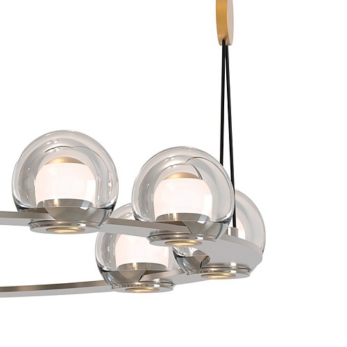 Металлический каркас черного цвета со сферическими плафонами, двойной источник света - внутри стеклянного плафона свет направлен вверх, спот в нижней части плафона светит вниз, регулируемая высота.