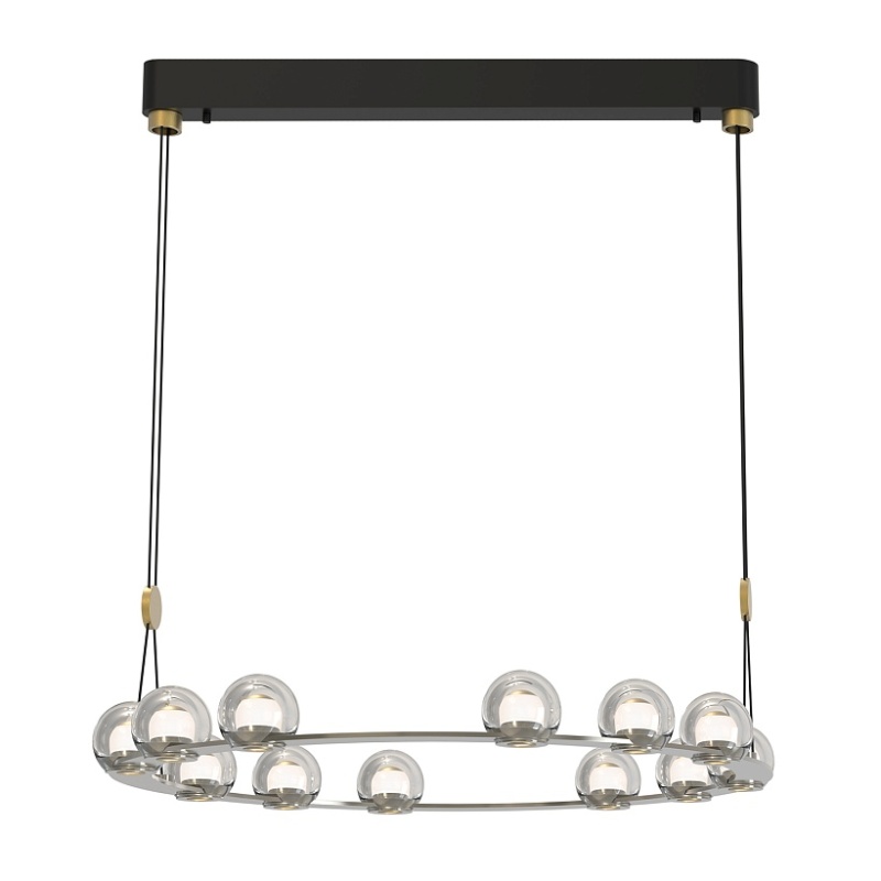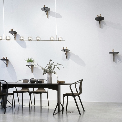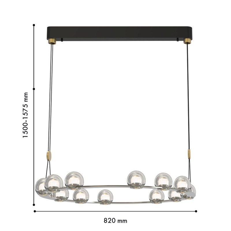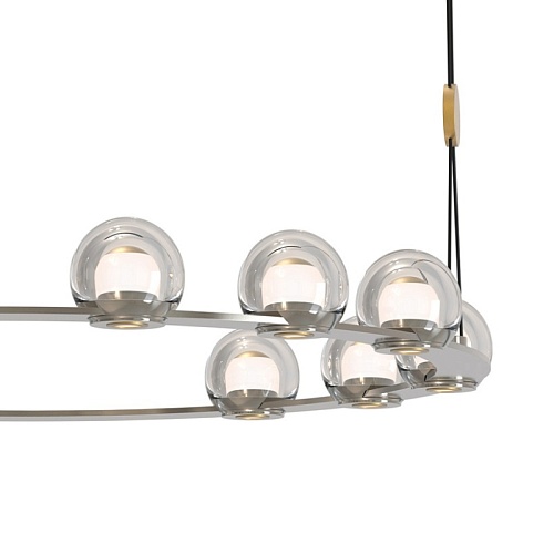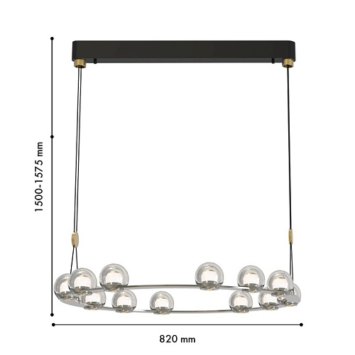 Металлчисекий каркас черного цвета, сферические плафоны, двойной источник света - внутри стеклянного плафона свет направлен вверх, спот в нижней части плафона светит вниз, регулируемая высота.
