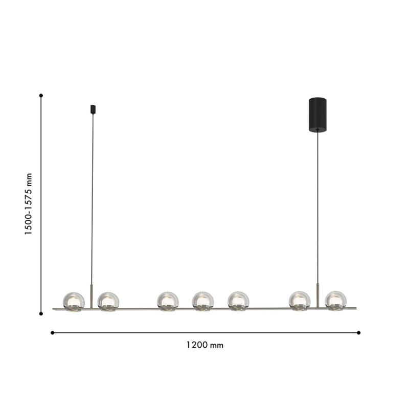 Металлический каркас черного цвета со сферическими плафонами, двойной источник света - внутри стеклянного плафона свет направлен вверх, спот в нижней части плафона светит вниз, регулируемая высота.