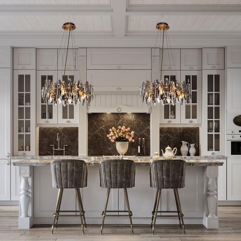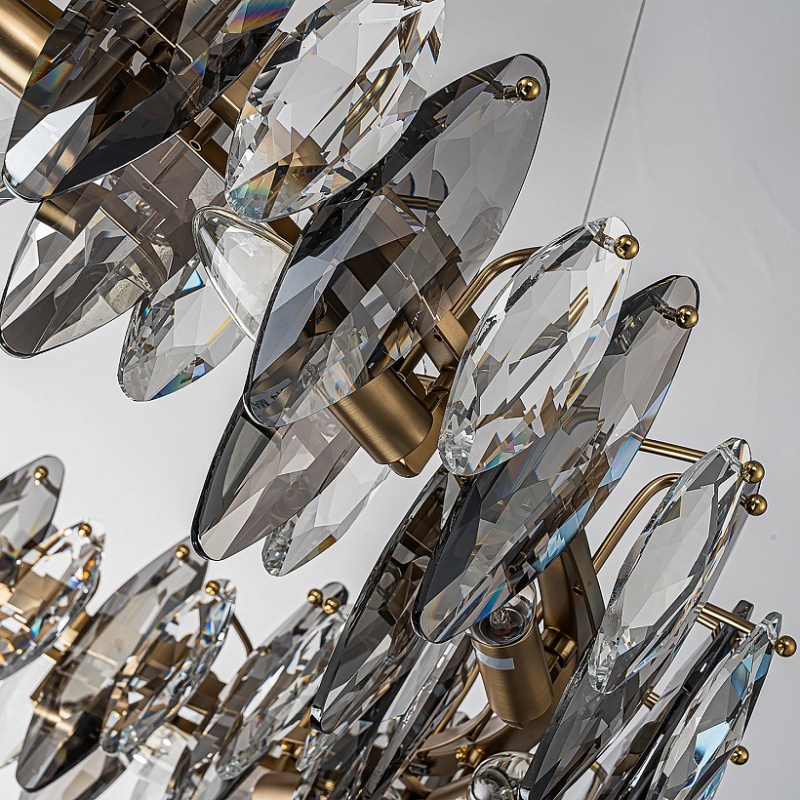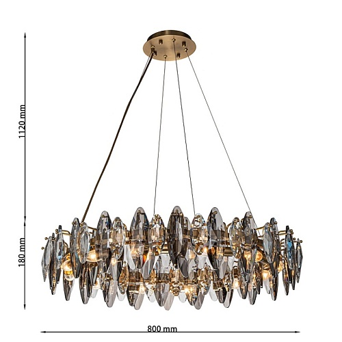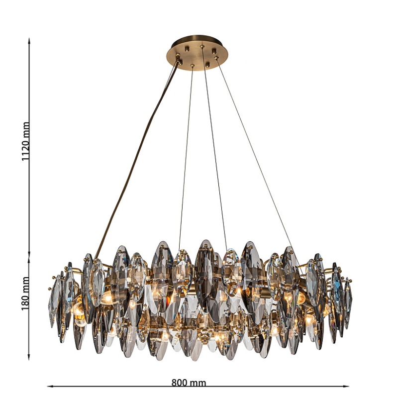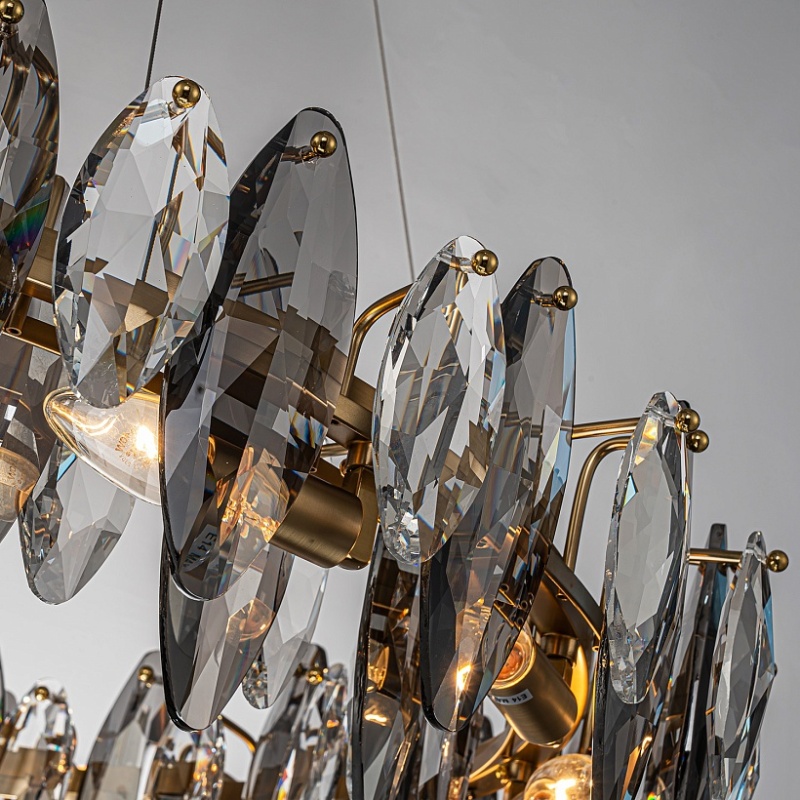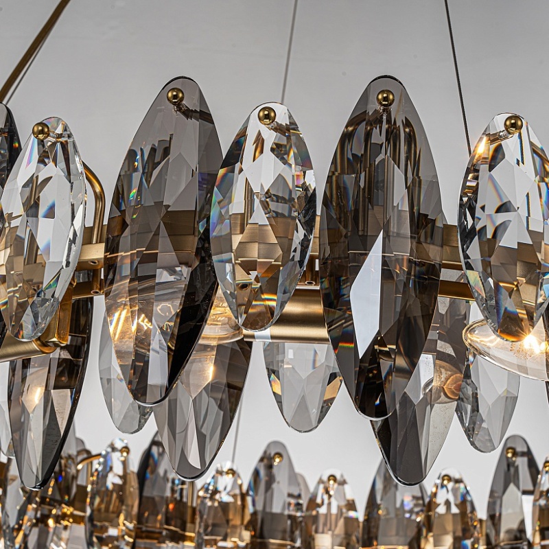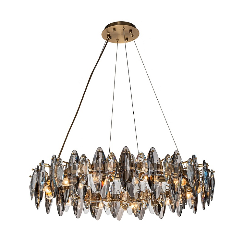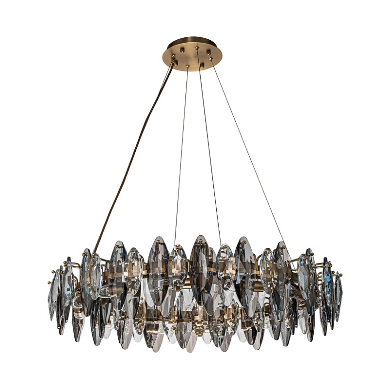 Подвесная кольцевая люстра диаметром 80 см, каркас в бронзовом цвете, лепестки прозрачного и дымчато-серого хрусталя разного размера, регулируемая высота.