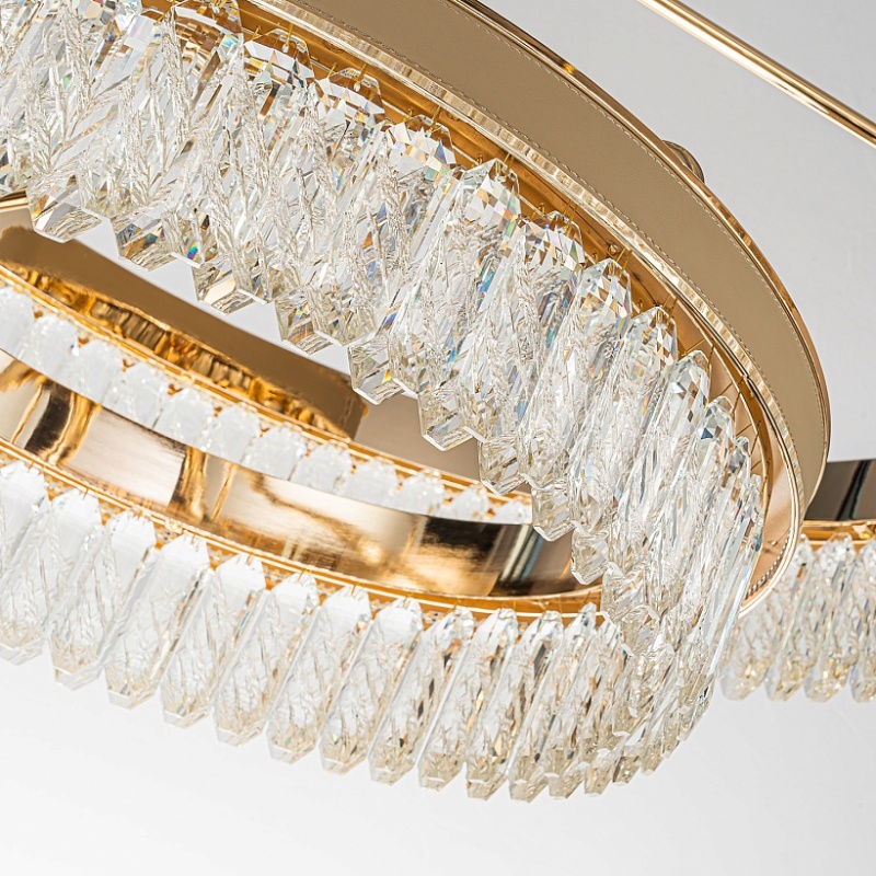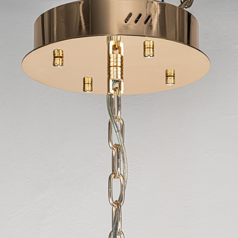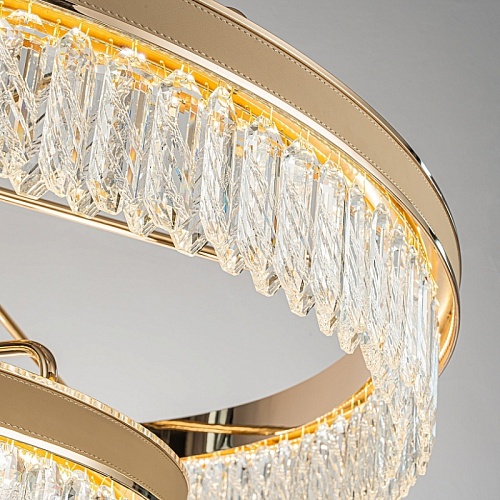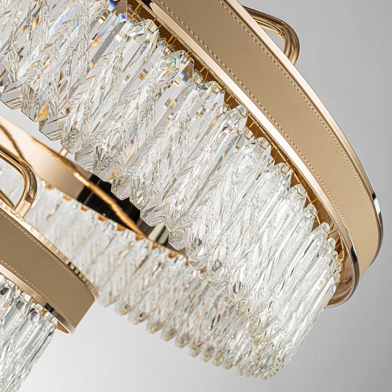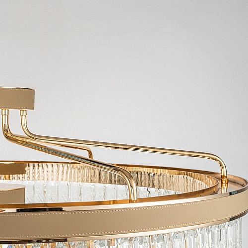 Металлический каркас, каркас золотого цвета, декоративные вставки из эко-кожи бежевого цвета, хрустальные подвески вытянутой формы с диагональным узором, регулируемая высота.