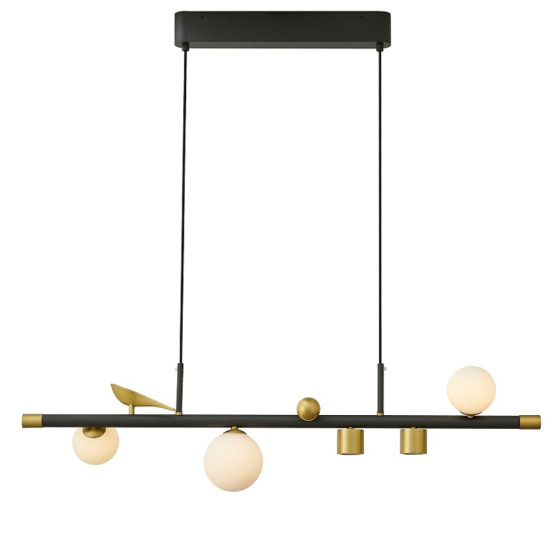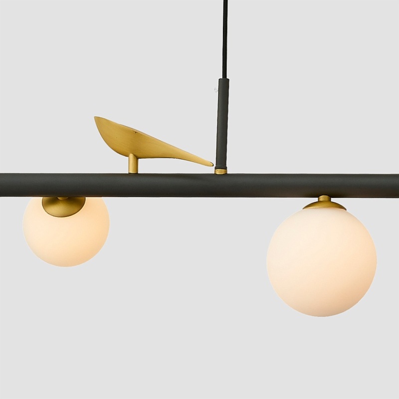 Металлический каркас черного матового цвета, круглые белые плафоны выполненные из выдувного стекла, два миниатюрных спота дают направленный вниз поток света, золотой декоративный элемент в виде птицы, регулируемая высота.