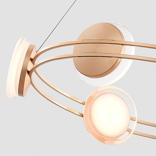 Металлический каркас золотого цвета, акриловые плафоны в виде дисков с прозрачным объемным ободком и плоской матовой внутренней частью со встроенным модулем LED, регулируемая высота.