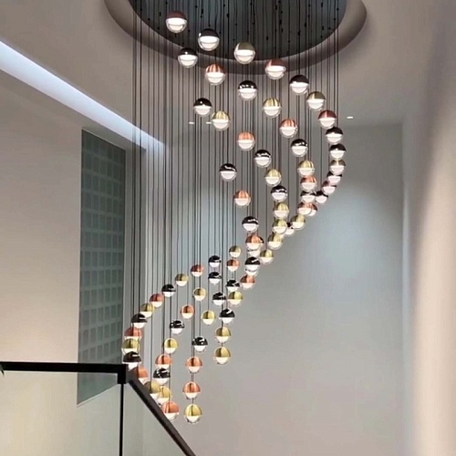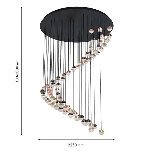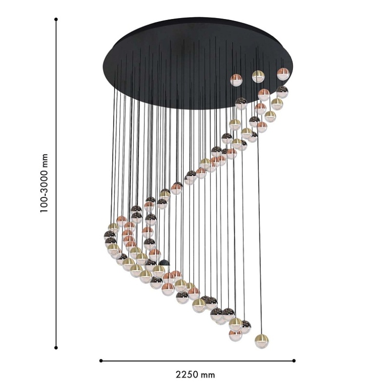 Металлический каркас черного глянцевого цвета, каскад из шарообразных плафонов, состоящих из двух половин: рассеивателя из прозрачного акрила снизу и металлической части в золотом, черном глянцевом и цвете розовое золото сверху, LED-модуль.