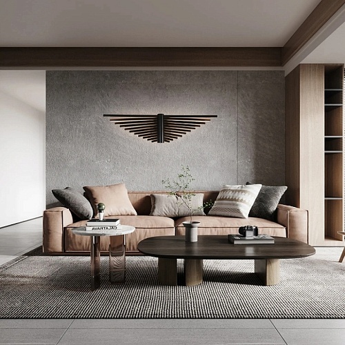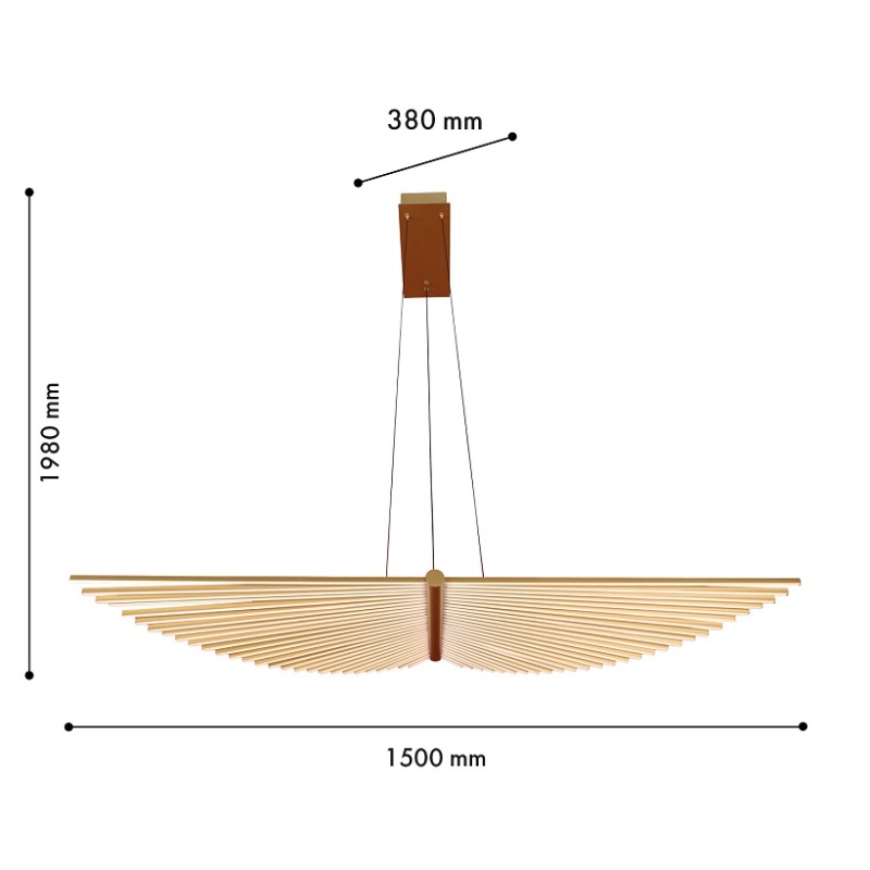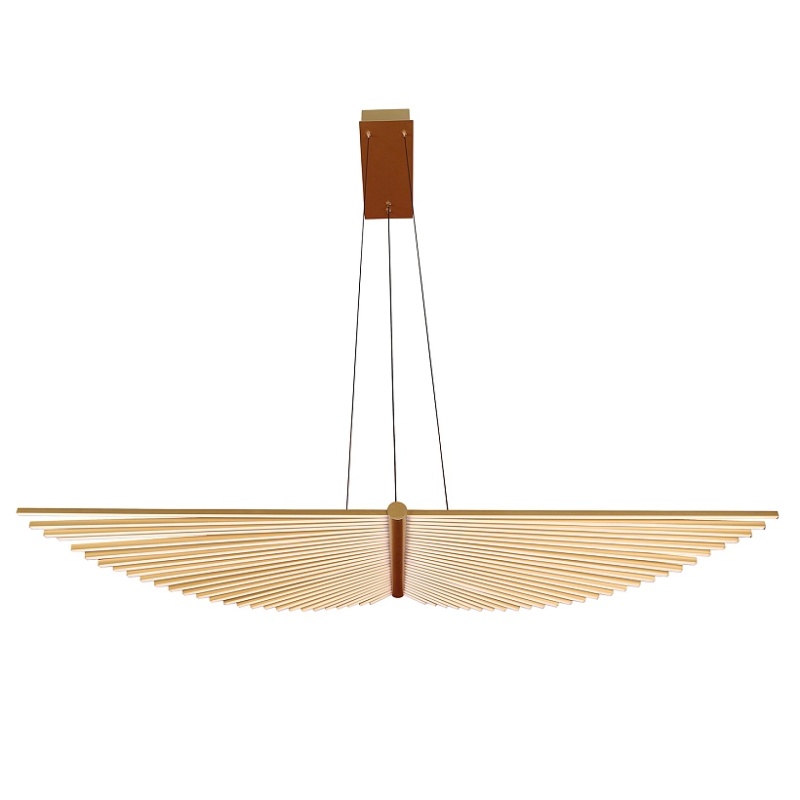 Подвесная люстра, каркас в цвете матовое золото, конструкция в виде распахнутых крыльев из тонких металлических планок, в которые встроены светодиодные ленты.
