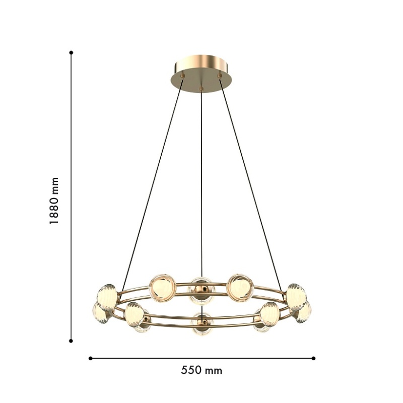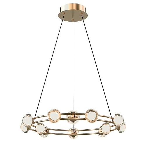 Каркас в цвете гальваническое золото, с тонкими металлическими кольцами и акриловыми рельефными плафонами, внутри которых расположена модуль LED, плафоны расположены как по внешнему, так и по внутреннему периметру кольца.