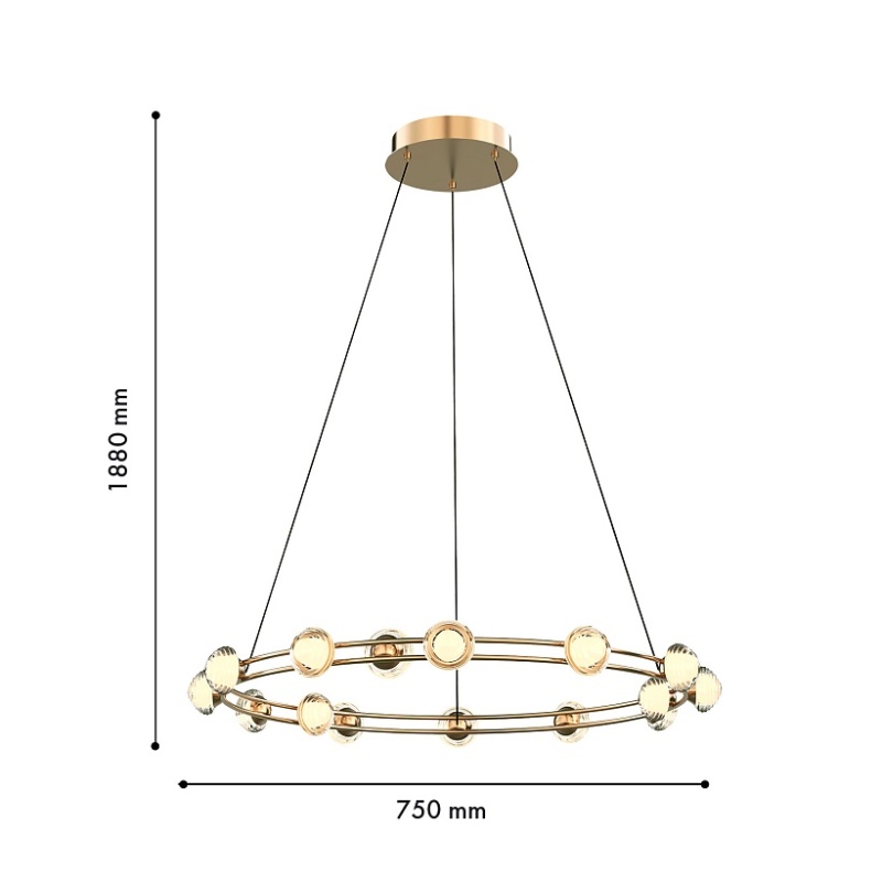 Каркас в цвете гальваническое золото, с тонкими металлическими кольцами и акриловыми рельефными плафонами, внутри которых расположена модуль LED, плафоны расположены как по внешнему, так и по внутреннему периметру кольца.