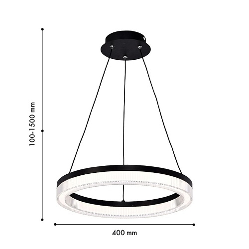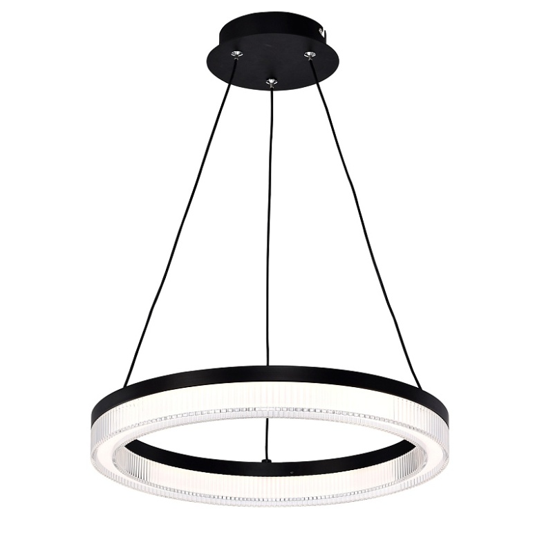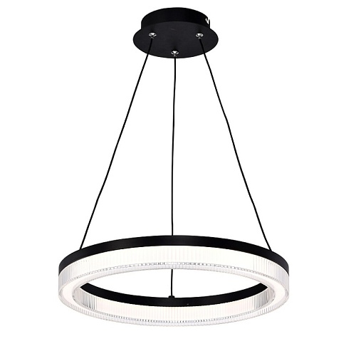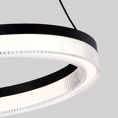 Металлический каркас черного цвета, декоративный акриловый плафон со сложным многослойным оптическим узором, регулируемая высота.